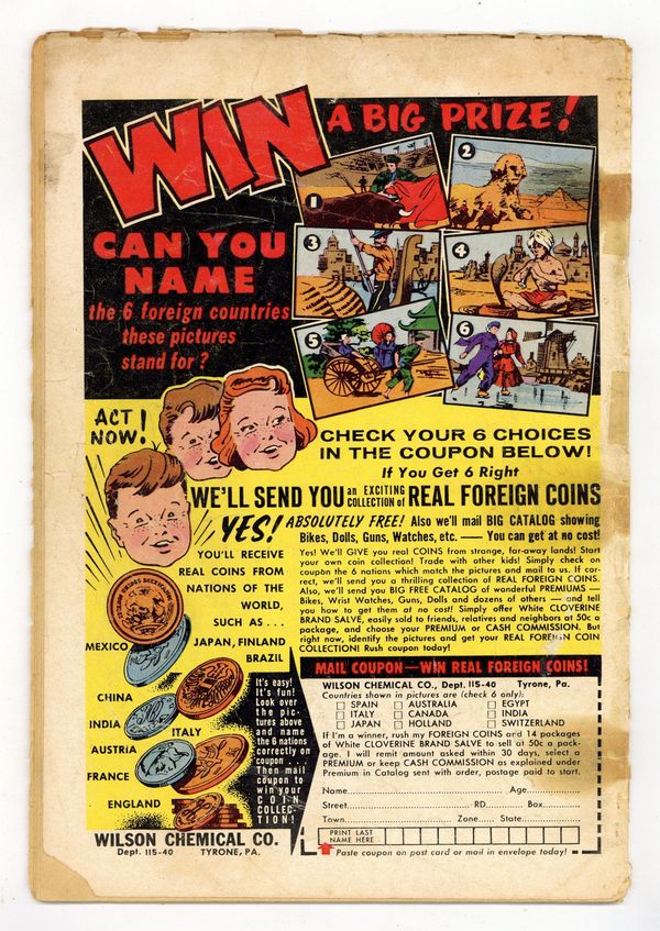 - RESTORATION. Color touch, tear seals. 4" cumulative spine split. Cover and centerfold detached at one staple. Water damage. Glue on spine.