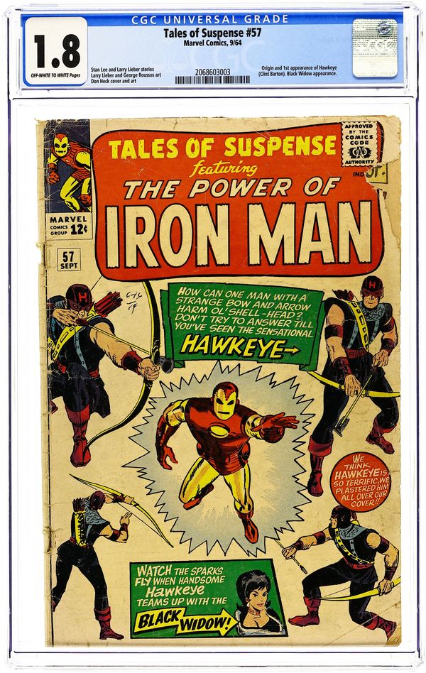 Ended Jul 16 2025 Bid History 19 bids Winning Bid $140 Cover by Don Heck. First appearance of Hawkeye in "Hawkeye, the Marksman!", script by Stan Lee, art by Don Heck; A carnival marksman tries to become a super-hero, but after a misunderstanding with the police he falls in with the Black Widow; Hawkeye attacks Iron Man at the Widow's request, but when he accidentally injures his partner in the fight he flees to get her to safety. "The Runner" text story. "The Watcher's Power!", script by Stan Lee (plot) and Larry Lieber (script), pencils by Larry Lieber, inks by George Roussos (as George Bell); Space Pirates plan to attack a rich planet, thinking the Watcher will not interfere; They are destroyed because they unknowingly targeted the Watcher's home world, the one planet that he can interfere with. 36 pages, full color. Cover price $0.12. Grade: CGC 1.8 explanation of grade Condition: Used (collectible)