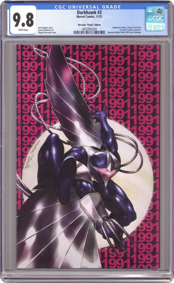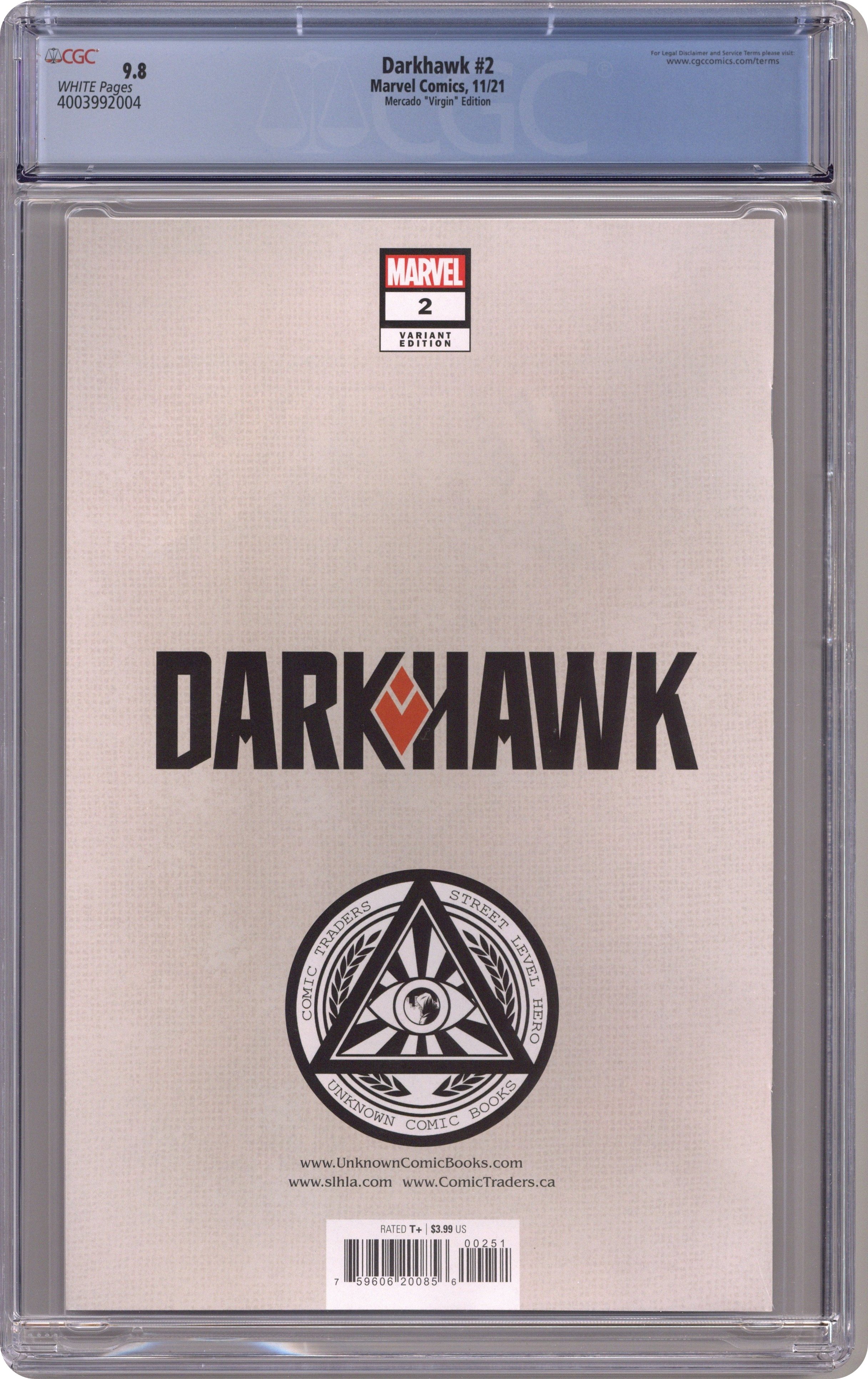 Ended May 6 2025 Winning Bid $17 Comics Illuminati (Unknown Comics, Comic Traders, and Street Level Hero) exclusive virgin variant by Miguel Mercado. Written by Kyle Higgins. Art by Juanan Ramirez. Connor Young: star point guard, recently diagnosed with MS and the new armored hero, DARKHAWK! But why was he chosen? Was it destiny? Fate? A cosmic coincidence? And what does it mean for his path forward? He'll need to figure that out soon, before he has a run in a with a certain web-slinger… 28 pages, full color. Rated T+ Grade: CGC 9.8 explanation of grade Condition: Used (collectible)