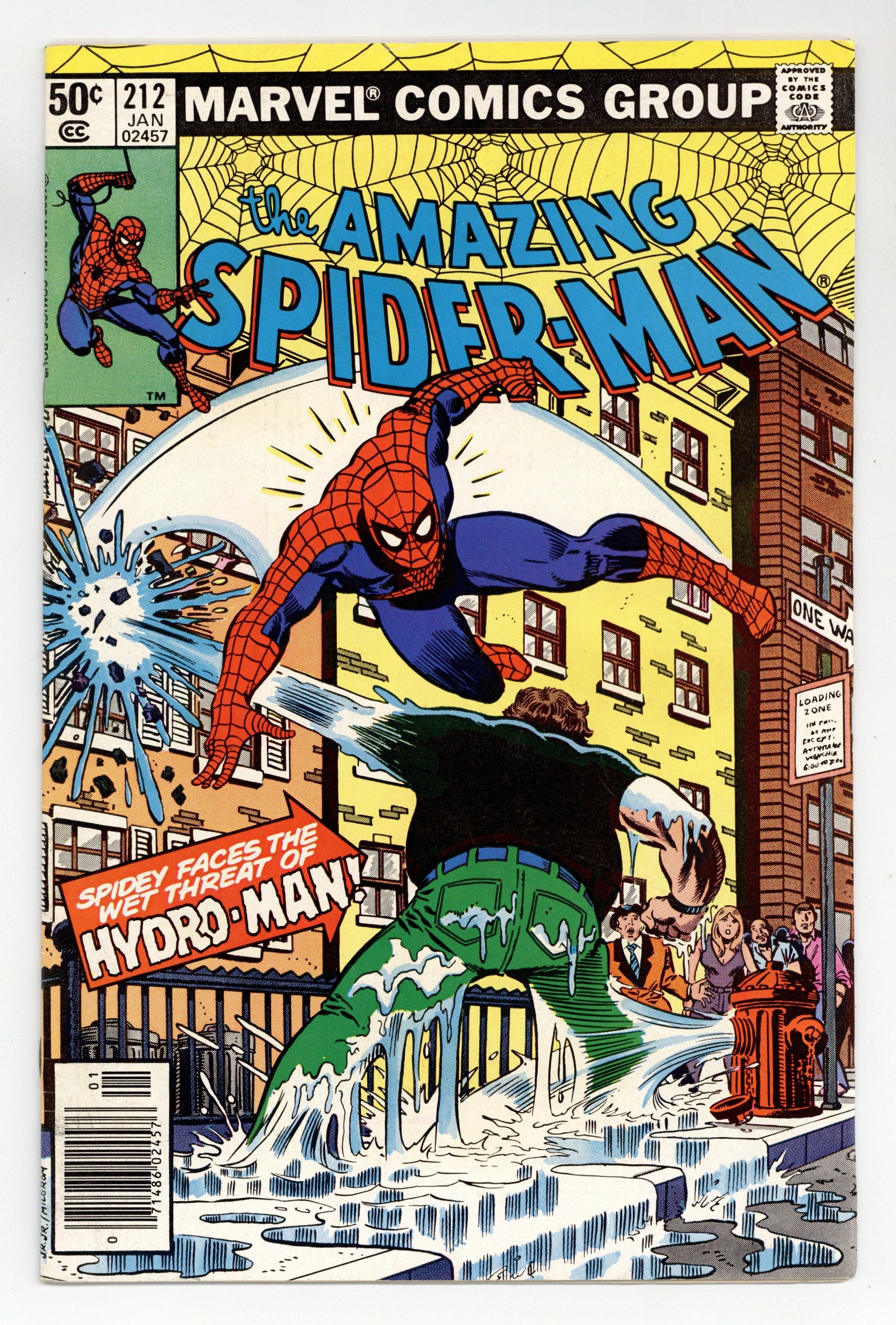 Ended May 13 2025 Winning Bid $31 Newsstand Edition. "The Coming of Hydroman!" First appearance of Hydro-Man. Script by Denny O'Neil. Art by John Romita Jr. (breakdowns) and Jim Mooney (finishes). Cover by John Romita Jr. and Al Milgrom. The adventure with the Sub-Mariner is over! And now the cargo ship with the wall-crawling escort heads back into port. But before the vessel can dock, a bizarre accident sends a crewmember tumbling overboard near an experimental undersea generator! And instantly a new super-villain is born...Hydro-Man! Shortly thereafter Morrie Bench (aka Hydro-Man) starts settling scores with old enemies across the city! And Spider-Man is on his list! At high noon atop an NYC office building, Hydro-Man tries to drown the web-slinger! Does the amazing one need a life jacket? Cameo appearances by J. Jonah Jameson and Joe Robertson. (Notes: Hydro-Man returns in Amazing Spider-Man 217. This issue includes a full-page ad for Hostess Fruit Pies featuring Captain America and Nick Fury vs. the Trapster.) 36 pgs. Cover price $0.50. Grade: FN+ 6.5 explanation of grade Condition: Used (collectible)