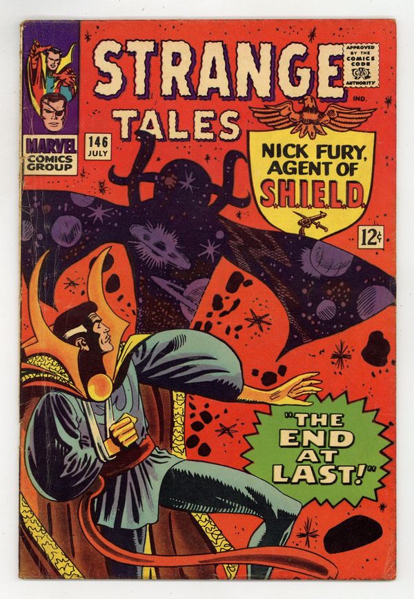 Cover art by Steve Ditko. Nick Fury stars in "When the Unliving Strike!", script by Stan Lee and Jack Kirby (co-plot), pencils by Jack Kirby (layouts) and Don Heck, inks by Mike Esposito (as Mickey Demeo); Aboard the Heli-Carrier Count Royale, a representative of A.I.M. (Advanced Idea Mechanics) a society of the world's greatest intellects, is offended by SHIELD's security measures; Fury uses a sonic vibrator to blast into an underwater base but is trapped between electric energy waves; A stalemate occurs when Fury reveals he has fission bombs that would blow up the base; Story continues in part from Tales of Suspense 78 and, to a lesser extent, #79. "The End--at Last!", script by Steve Ditko (plot) and Denny O'Neil (dialogue), art by Steve Ditko; Using his mystic powers to temporarily bind the sleeping Eternity Dormammu lures Strange to another dimension and challenges him but as they begin their mystical combat Eternity breaks free; He tells Dormammu to end the violence, but instead he attacks Eternity; Their encounter is brief and destructive as Dormammu is smashed between two colliding spheres; Eternity vanishes while Strange is hurled between dimensions and rescued by The Ancient One; Appearances by Baron Mordo and Clea (who is finally named in this issue!) Merry Marvel Marching Society info and coupon. NOTE: First appearance of A.I.M. (Advanced Idea Mechanics). 36 pgs., full color. Cover price $0.12. Grade: GD+ 2.5 explanation of grade Condition: Used (collectible)