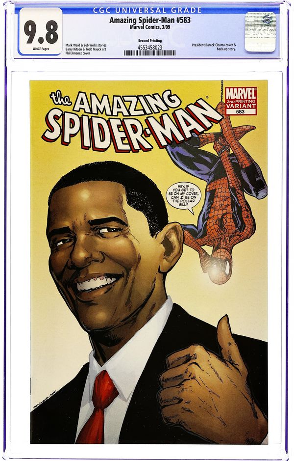 Ended Apr 30 2025 Winning Bid $32 2ND PRINTING - Special Obama Variant Cover of Amazing Spider-Man! Spidey meets President Barack Obama - Written by MARK WAID, Pencils by BARRY KITSON, Cover by PHIL JIMENEZ. YOU ASKED FOR IT, YOU GOT IT! PETER PARKER ON A DATE! After the revelations of 'Mind on Fire', love is in the air for more than one member of the cast and Pete finally gets some time out with the ladies. (and who better to bring it to you than two men who both had dates as recently as 1987!) Amidst the romance though, forces are gathering that will spell trouble for Peter in the months to come. From Marvel Comics. Also to celebrate the inauguration of Barack Obama, Marvel proudly presents this new printing of Amazing Spider-Man #583 with an all-new bonus story teaming one of the world's most recognizable political figures with the world's greatest super-hero! Written by Zeb Wells with art by Todd Nauck & Frank D'Armata, the new story takes place in Washington, DC on Inauguration Day as one of Spider-Man's oldest foes attempts to thwart the swearing in ceremony of the 44th President of the United States! 44 pgs. Cover price $3.99. Grade: CGC 9.8 explanation of grade Condition: Used (collectible)