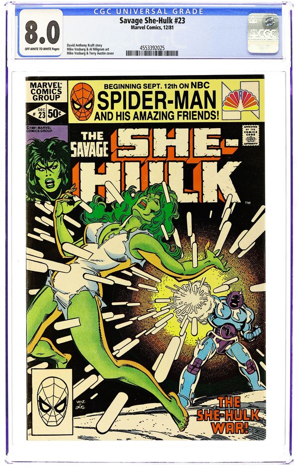 Ended May 16 2025 Winning Bid $22 "The She-Hulk War!" Story by David Anthony Kraft. Art by Mike Vosburg, Al Milgrom, Dave Simons, and Jack Abel. Radius has failed to kill the She-Hulk, Well, Shade's next assassin, Torque, will not fail. Either that or he'll simply make the Savage One angry, and we all know what happens when a Hulk gets angry. Yep, bad things. Cover price $0.50. Grade: CGC 8.0 explanation of grade Condition: Used (collectible)