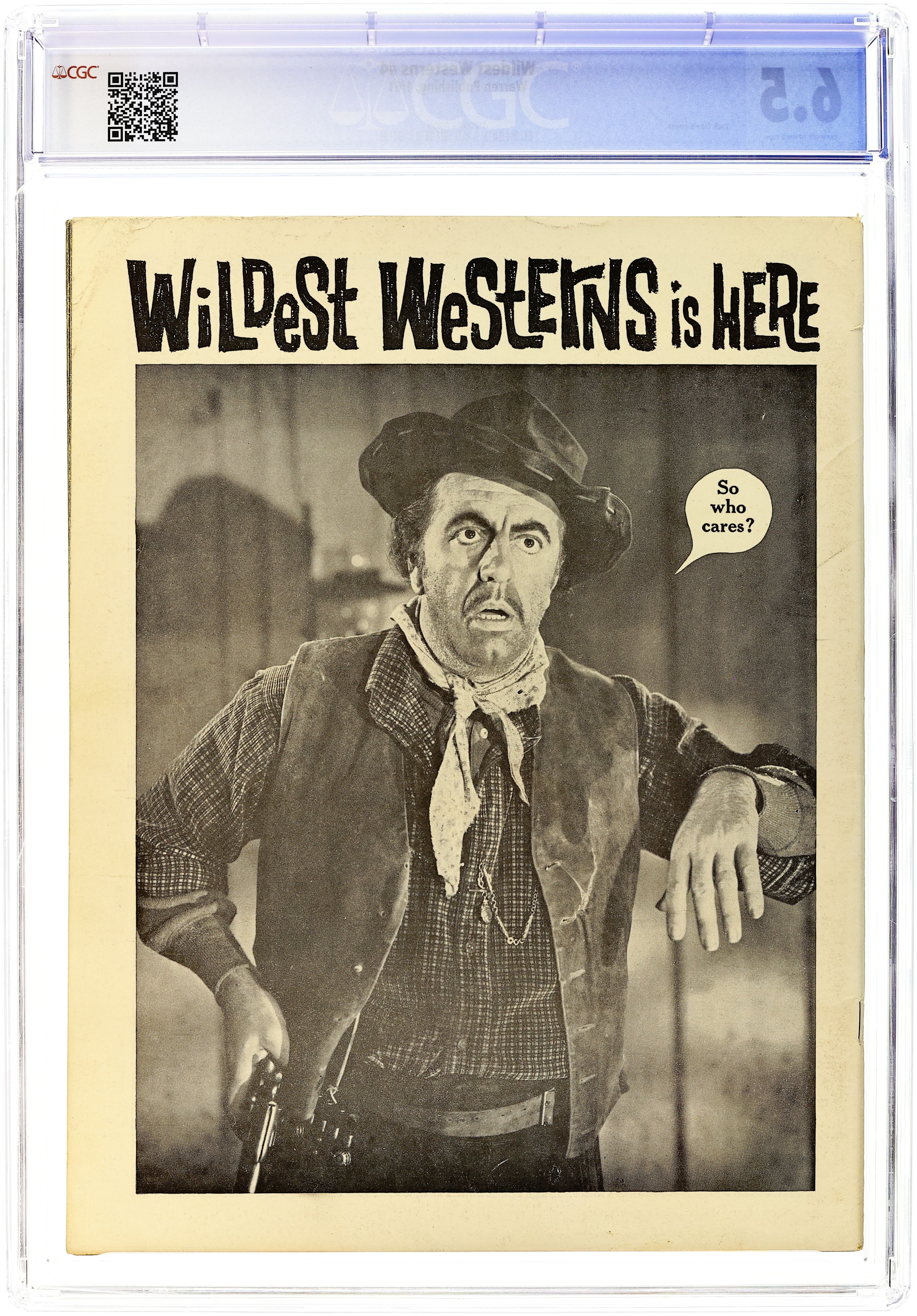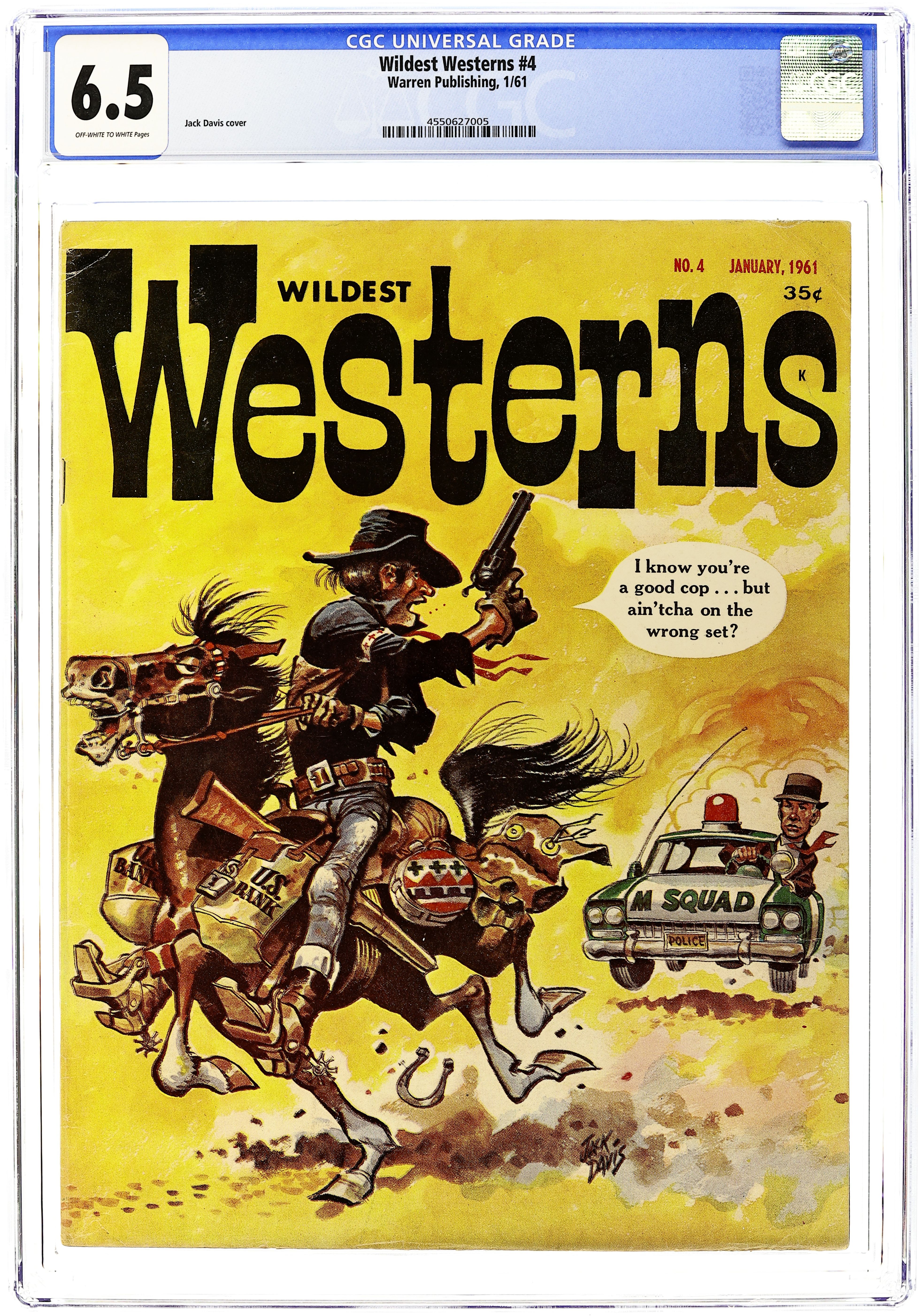Ended May 2 2025 Winning Bid $38 Cover by Jack Davis. Edited by Sam Sherman, working as Remuda Charlie Stringer. Stories and art by Paul Laikin, Jack Davis and John Severin. A Famous Monsters of Filmland-style tribute to the Western, from the same publisher. A profile of Western actor (and former Flash Gordon) Buster Crabbe; horse training with legendary stuntman Yakima Canutt; gunfighter art by Severin. 8 1/2 in. x 11 in. 52 pages, B&W. NOTE: This title started as Favorite Westerns of Filmland (1960 Magazine) for issue #1 & #2 Cover price $0.35. Grade: CGC 6.5 explanation of grade Condition: Used (collectible)