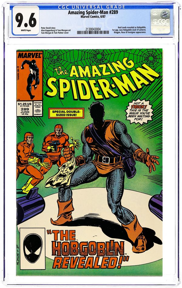 Direct Edition. "The Hobgoblin Revealed!" Death of Ned Leeds (aka the Hobgoblin). Script by Peter David. Pencils by Alan Kupperberg and Tom Palmer. Inks by Jim Fern. Cover by Tom Morgan and Tom Palmer. Story continues from the Spider-Man vs. Wolverine (1987) one-shot. Finally! The mystery that began over 50 issues ago is at last revealed! Who is the Hobgoblin? Or perhaps better asked now: Who was the Hobgoblin? Sadly the story opens with Ned Leeds' body being returned to New York following his murder in Berlin. Jonah, Peter, Betty, and Robbie are in shock...and completely oblivious to what really happened to Ned overseas. But the Kingpin knows what took place! He's furious that the Foreigner and Jack O'Lantern (aka Jason Macendale) made the hit without his approval! To retaliate against Macendale (aka the new Hobgoblin), the Kingpin tells the web-slinger where to find him! And in very short order a new era of Spider-Man vs. Hobgoblin battles begins! Cameo appearances by the Rose, Black Cat, and Flash Thompson. Flashback cameo by Wolverine. (Notes: The story in Web of Spider-Man 29 occurs during this issue. Ned Leeds first appeared way back in Amazing Spider-Man 18. The web-slinger settles the score with the Foreigner in Spectacular Spider-Man 129. Additional details about who was operating as the real Hobgoblin are revealed in the Spider-Man: Hobgoblin Lives (1997) Limited Series written by Roger Stern.) 52 pgs. Cover price $1.25. Grade: CGC 9.6 explanation of grade Condition: Used (collectible)