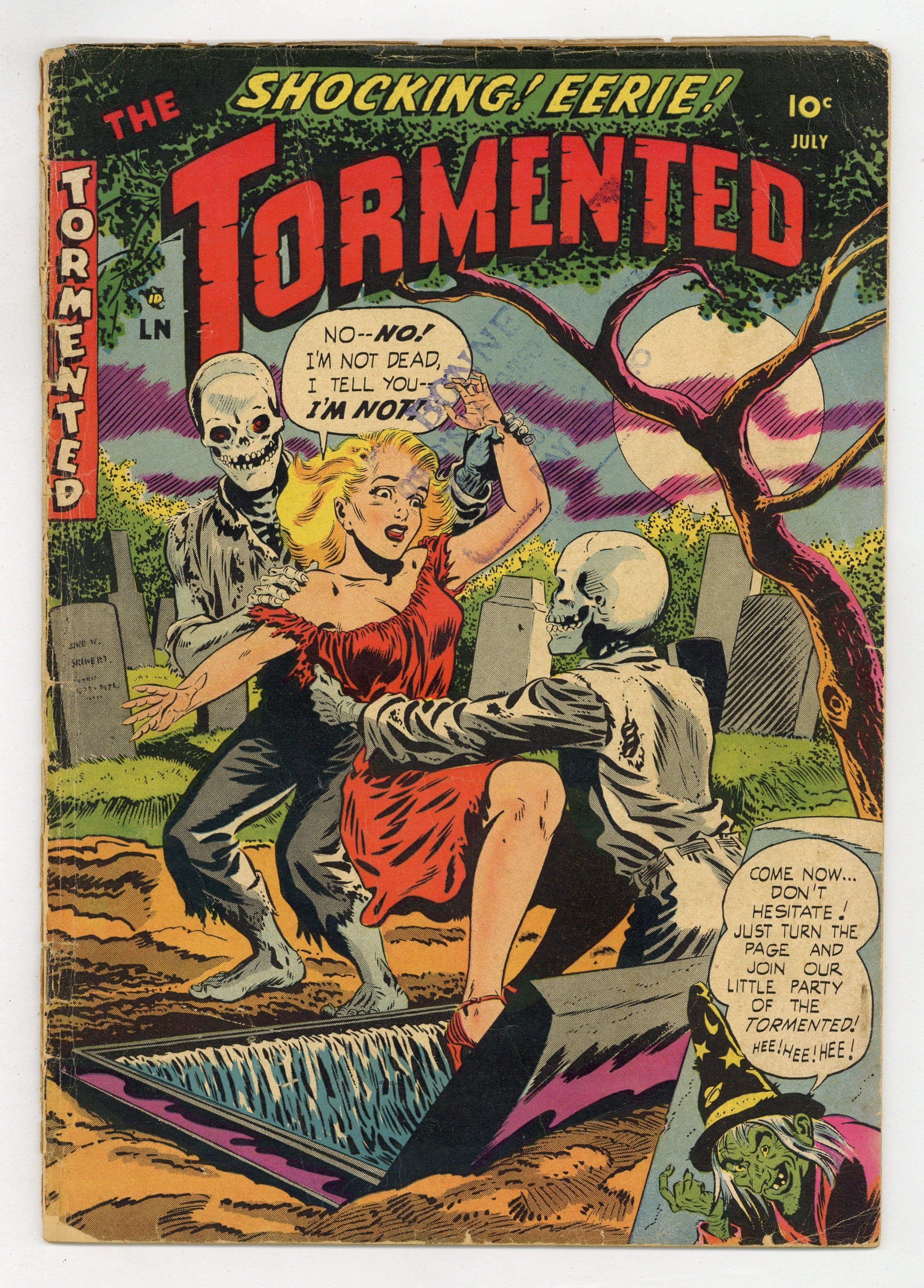 Cover by Mike Roy. Stories and art by Mike Sekowsky and Mike Roy. Pre-Code horror comics from publisher Sterling. John visits his old friend Ralph at his creepy house in the woods, only to learn Ralph and his friends are actually giant caterpillars, ready to weave their webs around him. Haven't seen that one before. After a jewel heist, Bart and Laura hide out at a strange bird sanctuary deep in the woods that holds a terrible secret. A hunting party in yet another remote section of woods meets an old man with a strange taste in humanity. Caterpillar House; True Enigmas of the Tormented; The Girl Who Wasn't There; The Dream; The Bird Sanctuary; Dinner For One. 36 pages, Full Color. Cover price $0.10. Grade: FR 1.0 explanation of grade Condition: Used (collectible)