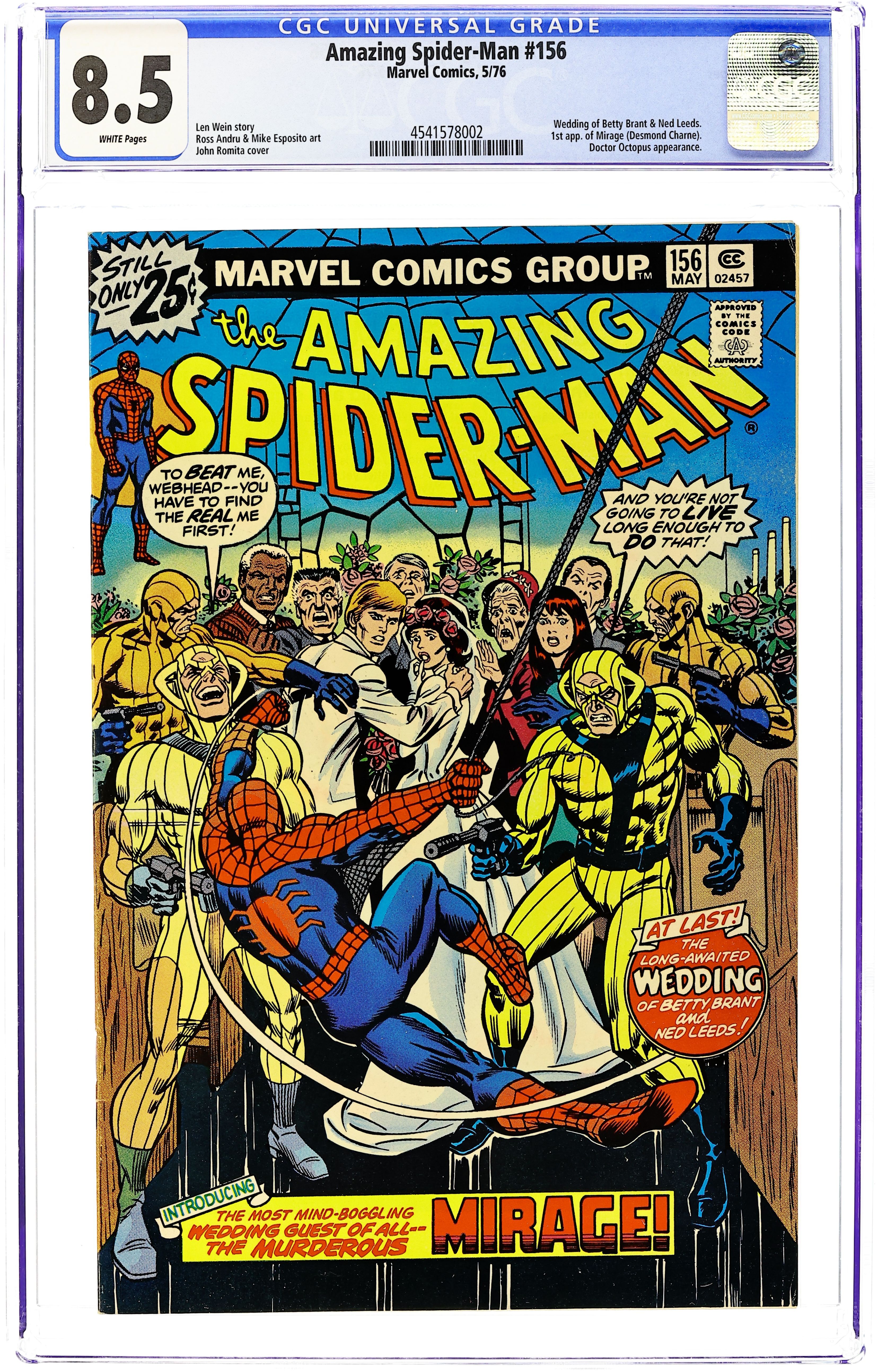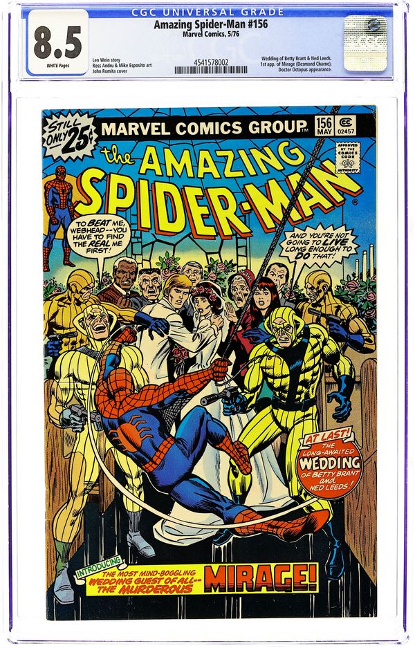 "On a Clear Day, You Can See...The Mirage!" Script by Len Wein. Pencils by Ross Andru. Inks by Mike Esposito and Dave Hunt (backgrounds). Cover by John Romita. Wedding bells ring in the pages of the Amazing Spider-Man! As Peter's former girlfriend (Betty Brant) and the web-slinger's future foe (Ned Leeds aka the Hobgoblin) tie the knot! The joyous ceremony proceeds as planned until a wedding crasher shows up! The Mirage! And he's not just looking for free hors d'oeuvres! Can the wall-crawler see through the Mirage and restore Betty and Ned's happy day? First Appearance of the Mirage. Appearances by Aunt May, Anna Watson, Mary Jane Watson, Flash Thompson, Harry Osborn, Liz Allan, J. Jonah Jameson, Joe Robertson, and Doctor Octopus. (Notes: The Mirage appears next in Marvel Two-in-One 96. The letters page includes Marvel Value Stamp series B #83 the Incredible Hulk. This story was reprinted in Marvel Tales 133. A 30-cent cover price variant exists for this issue.) 36 pages. Cover price $0.25. Grade: CGC 8.5 explanation of grade Condition: Used (collectible)