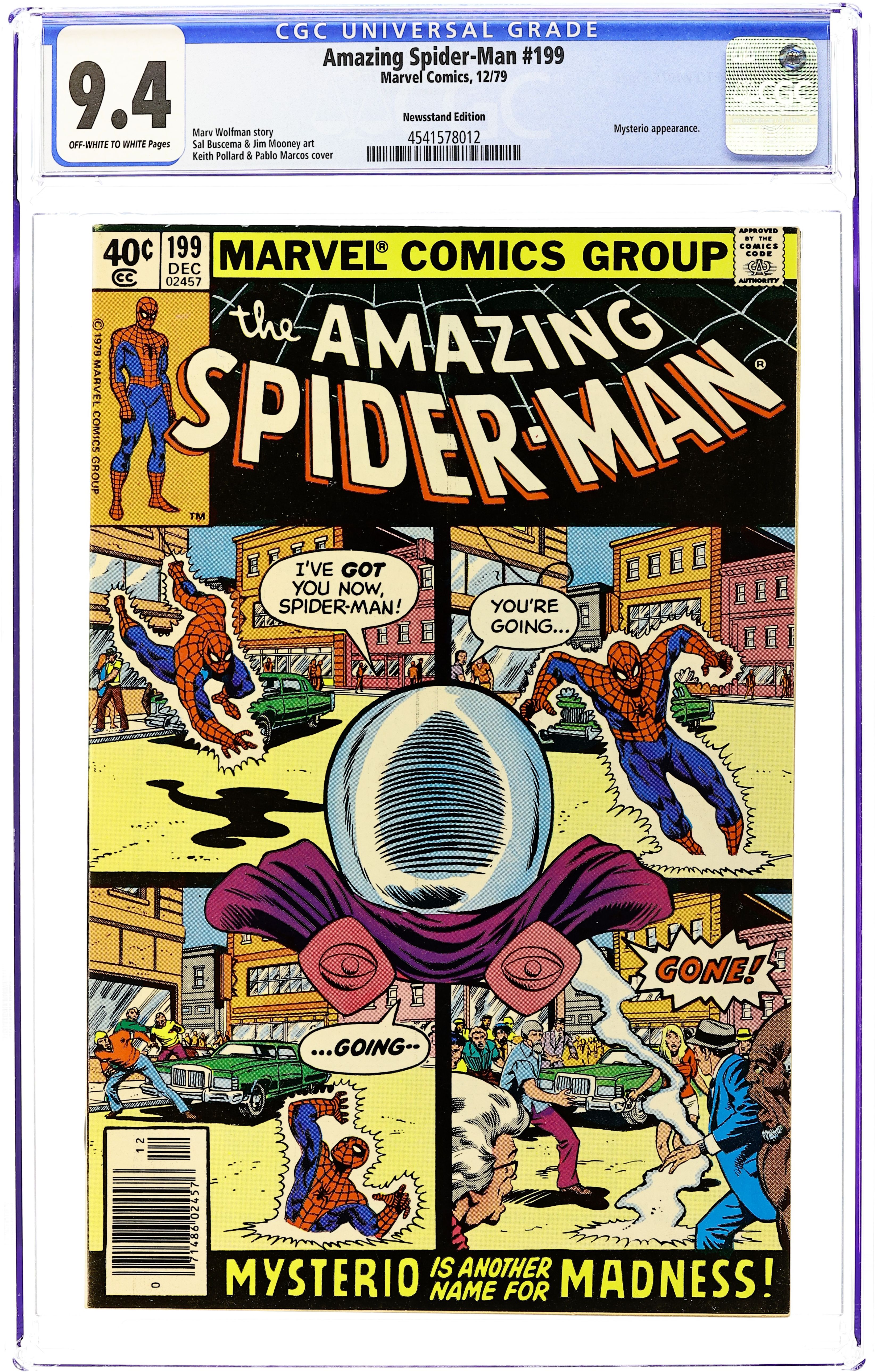 Newsstand Edition. "Now You See Me! Now You Die!" Part 2 of 2. Script by Marv Wolfman. Art by Sal Buscema (breakdowns) and Jim Mooney (finishes). Cover by Keith Pollard and Pablo Marcos. The madness of Mysterio plagues the wall-crawler! After escaping from the Master of Illusion's underwater trap at the nursing home, the web-slinger returns to his aunt's former home in Queens...only to find Mysterio! Why are the bad guys so interested in May's old house? The amazing one tackles Mysterio to get the answers, but unfortunately all he gets is another defeat! Will Spider-Man ever find out what happened to his dear Aunt May? Cameo appearances by Harry Osborn, Liz Allan, Flash Thompson, Sha Shan, and the burglar. (Note: The wall-crawler battles Mysterio again in Spectacular Spider-Man 50 & 51.) 36 pages. Cover price $0.40. Grade: CGC 9.4 explanation of grade Condition: Used (collectible)