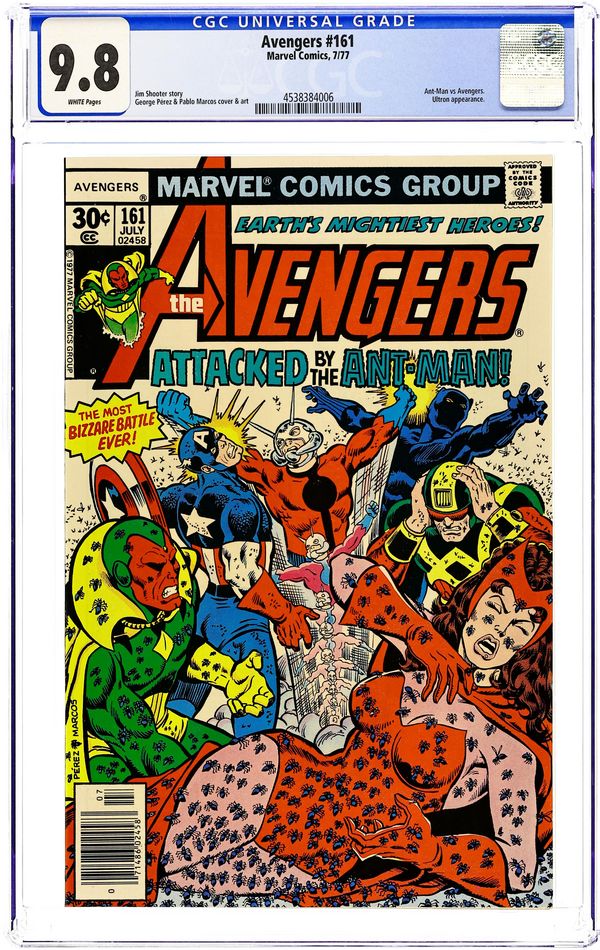 "Beware the Ant-Man!" Part 1 of 2. Script by Jim Shooter. Pencils by George Perez. Inks by Pablo Marcos. Cover by George Perez and Pablo Marcos. In incredible fashion the Avengers are attacked at their Fifth Avenue Mansion! And the assailant is none other than the Ant-Man! What in the world has happened to Hank Pym?!? Fortunately, with help from the Wasp, the Avengers corral their diminutive teammate! But that only buys Earth's Mightiest Heroes a few more hours until the next attacker arrives...a certain adamantium attacker! It's a super showdown inside Avengers Mansion as eight avengers lay it all on the line against Ultron! Cameo appearances by Hawkeye and the Two-Gun Kid. Avengers Lineup: Beast, Black Panther, Captain America, Iron Man, Scarlet Witch, Vision, Wasp, and Wonder Man. (Notes: Ultron previously appeared in Fantastic Four 150. A 35-cent cover price variant exists for this issue.) 36 pgs. Cover price $0.30. Grade: CGC 9.8 explanation of grade Condition: Used (collectible)