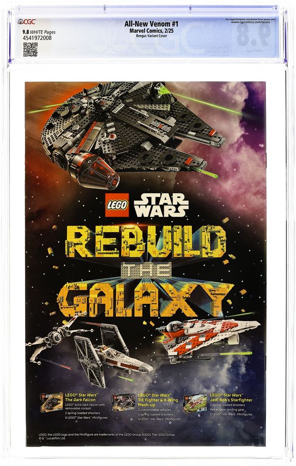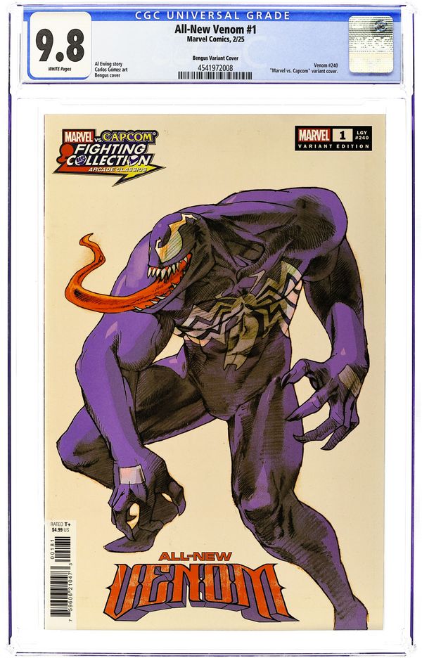 Written by Al Ewing. Art by Carlos Gomez. Cover by Bengus. WHO IS THE ALL-NEW VENOM? The smiling, swashbuckling spider-hero New York loves to hate to love is back - and more fun-loving than ever! That's right, it's... Wait, it's VENOM?! An all-new host is taking the symbiote in a whole new direction - but who? It could be the Journalist...the Terrorist...the Sidekick... or even the Mayor... We're giving you all the clues, good believers - but you won't know until the mask comes off! Writer Al Ewing (VENOM, IMMORTAL THOR) takes Venom in a completely new direction with artist Carlos Gómez (FANTASTIC FOUR, THE AMAZING MARY JANE) bringing the story to gorgeous life! 32 pages, full color. Rated T+ Cover price $4.99. Grade: CGC 9.8 explanation of grade Condition: Used (collectible) unless item is a new release