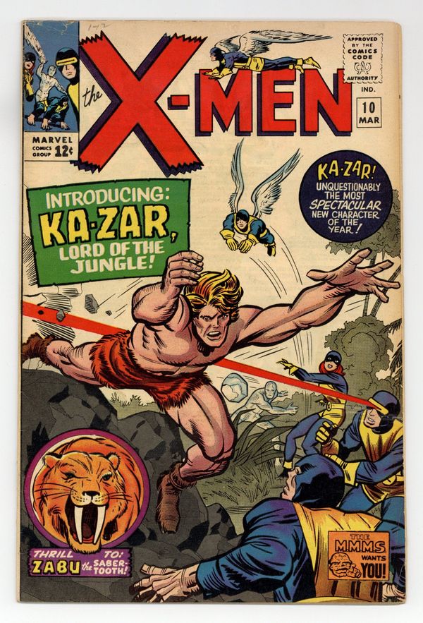 Cover pencils by Jack Kirby, inks by Chic Stone. The Coming of Ka-Zar, script by Stan Lee, pencils by Jack Kirby, inks by Chic Stone; Even though he is not a mutant, Xavier allows the X-Men to travel to Antarctica and enter the Savage Land to investigate the noble savage, Ka-Zar; They end up having to save Jean and Warren from being sacrificed by the savage Swamp Men; 1st Silver Age Ka-Zar. (The original Ka-Zar appeared in Marvel Comics #1 and Marvel Mystery Comics between 1939 andf 1942.) 36 pgs. $0.12. Cover price $0.12. Grade: GD 2.0 explanation of grade Condition: Used (collectible)