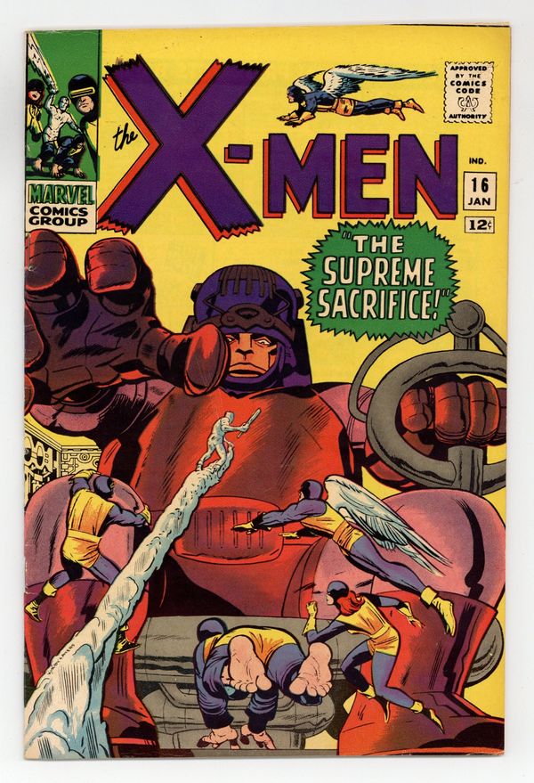 Cover pencils by Jack Kirby, inks by Dick Ayers. The Supreme Sacrifice!, script by Stan Lee, pencils by Jack Kirby (layouts) and Werner Roth [as Jay Gavin] (pencils), inks by Dick Ayers; With the X-Men captured, Xavier heads back to investigate a fallen Sentinel to try and figure out what stopped it; The X-Men escape and battle the Sentinels but it is the timely intervention of Professor X and the self sacrifice of Dr. Trask that stops Master Mold and saves the day. 36 pgs. $0.12. Cover price $0.12. Grade: VG+ 4.5 explanation of grade Condition: Used (collectible)