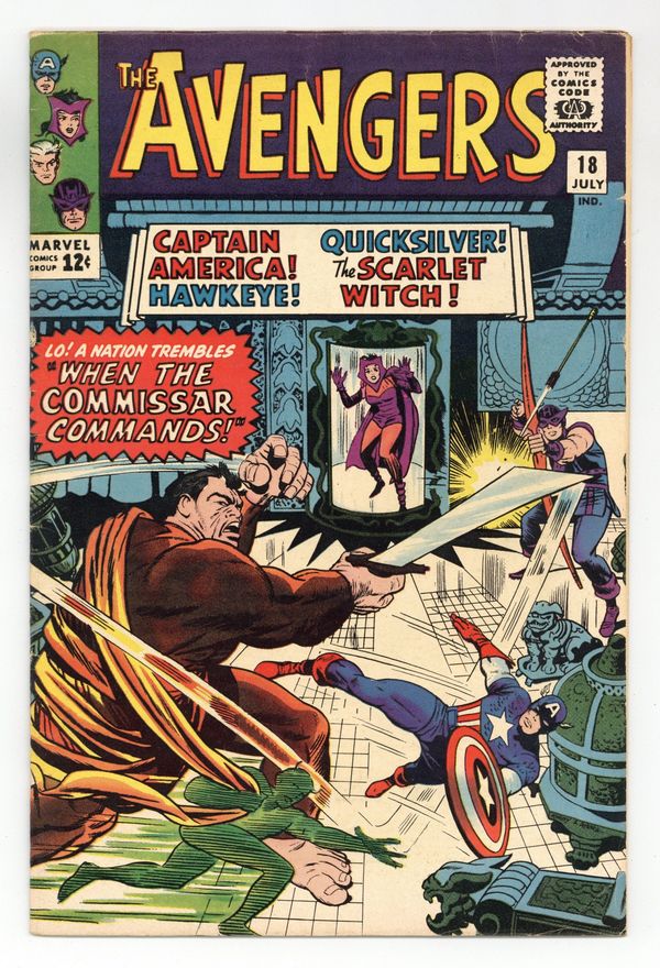Ended May 12 2025 Winning Bid $61 Cover pencils by Jack Kirby, inks by Dick Ayers. "When the Commissar Commands!", script by Stan Lee, pencils by Don Heck, inks by Dick Ayers; The Reds (evil commies) led by the monstrous Commissar are enslaving the peaceful land of Sin-Cong; The Avengers travel to that land to aid the people. Commissar defeats them all except the Scarlet Witch who discovers and destroys the Commissar's control panel, ending him. Avengers Roll Call: Captain America, Hawkeye, Quicksilver, and the Scarlet Witch. Appearance by Edwin Jarvis. Villains: Major Hoy and the Communists oppressors of Sin Cong (first and only appearance). Cameo by Nick Fury. Letter to the editor from Ted White (the writer?). Reprinted in Marvel Triple Action # 12. 36 pgs., full color. $0.12. Cover price $0.12. Grade: FN- 5.5 explanation of grade Condition: Used (collectible)