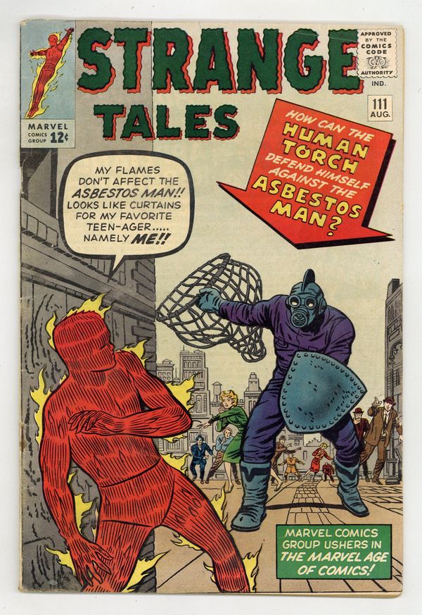Cover pencils by Jack Kirby, inks by Dick Ayers. Doctor Strange makes his 2nd appearance, and Baron Mordo makes his 1st appearance, in "Face-to-Face with the Magic of Baron Mordo!", script by Stan Lee and Steve Ditko (co-plot), art by Steve Ditko; In his castle in Europe, Baron Mordo plots to steal the secrets of his former master, The Ancient One; Sending his spirit form to Tibet, he causes Hamir to poison The Ancient One's food. Human Torch is cover featured in "Fighting to the Death with the Asbestos Man!", script by Stan Lee (plot) and Ernie Hart [as H. Huntley] (script), art by Dick Ayers; A frustrated scientist invents a fireproof suit in order to impress underworld hoods and become their partner in crime; The Torch is at first unable to defeat him, but with the advice of his sister he calms down and outsmarts the Asbestos Man. "Masquerade" text story. "Beware--the Machine!!!", script by Stan Lee (plot) and Larry Lieber (script), pencils by Larry Lieber, inks by Matt Fox; A super-intelligent computer is built by American scientists and attempts to conquer the world; It defends itself against humans. 36 pgs., full color. Cover price $0.12. Grade: GD+ 2.5 explanation of grade Condition: Used (collectible)