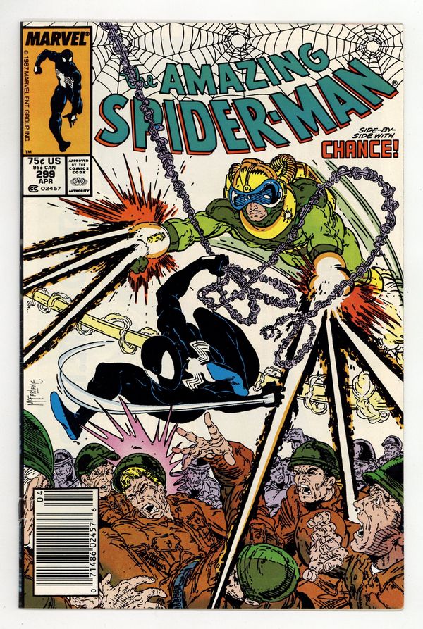 Newsstand Edition. "Survival of the Hittist!" Part 2 of 2. Script by David Michelinie. Pencils by Todd McFarlane. Inks by Bob McLeod. Cover by Todd McFarlane. After their waterfront arms theft goes awry, the Life Foundation turns the tables on Chance! The mysterious survivalist group abducts the mercenary and takes him to their secret headquarters in northern New Jersey! But thanks to a well-placed spider tracer, the web-slinger infiltrates the foundation's secluded colony the next day...and rescues Chance! So now the adversaries of 24 hours ago suddenly become allies to avoid death...courtesy of the Life Foundation! First appearance (and cameo on the last page) by Venom. Cameo appearances by Eddie Murphy, Paul Schaffer, and Joe Robertson. Last 75ยข issue. 36 pages, full color. (Note: Chance returns in Amazing Spider-Man 336.) Cover price $0.75. Grade: VG 4.0 explanation of grade Condition: Used (collectible)