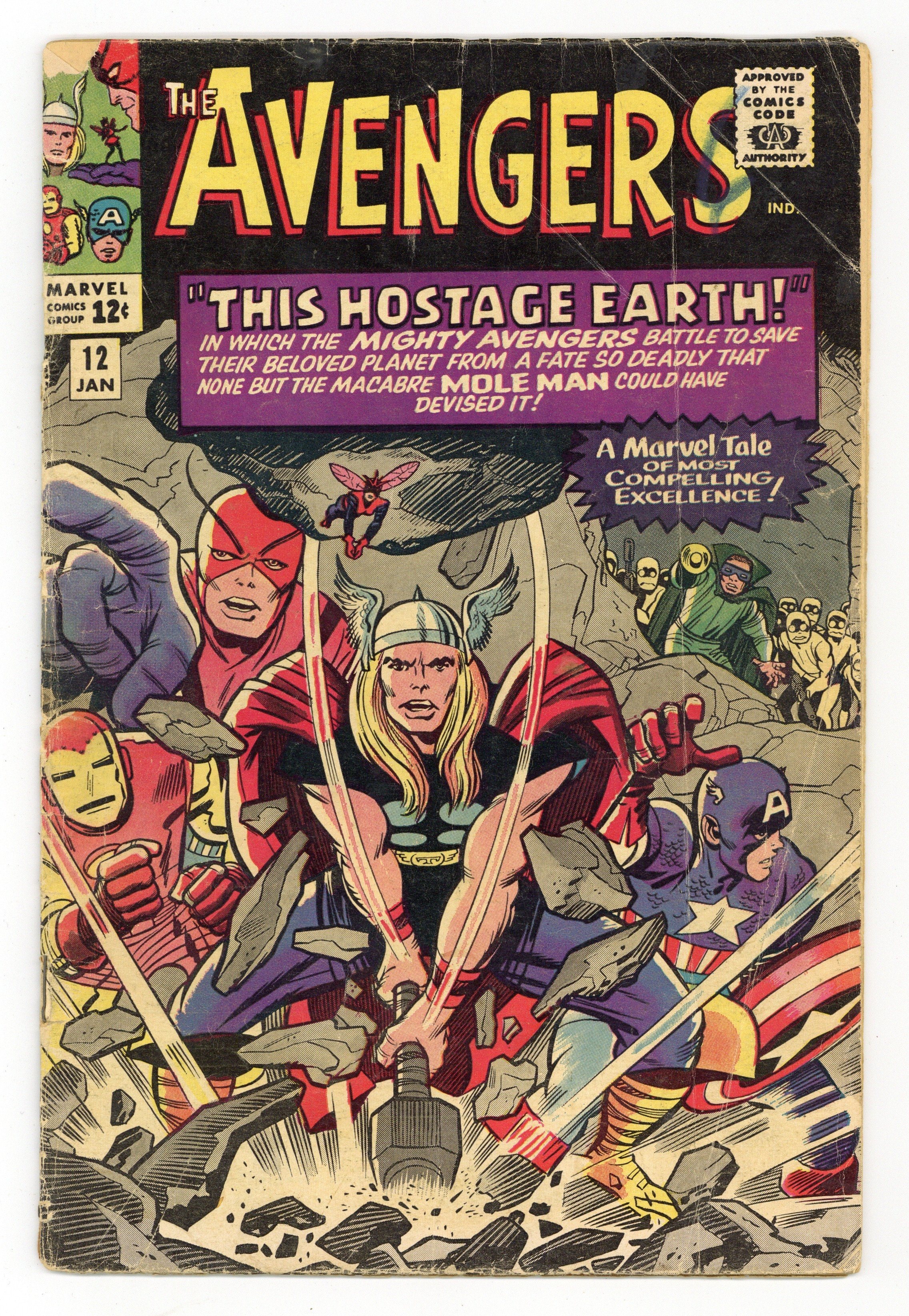Ended May 15 2025 Winning Bid $27 Cover pencils by Jack Kirby, inks by Chic Stone. "This Hostage Earth!", script by Stan Lee, pencils by Don Heck, inks by Dick Ayers; Ants warn Giant Man that there is something wrong, but none of the other Avengers believe him; In truth, it is the Mole Man, who plans to destroy the surface world by making the Earth spin very fast on its axis; And now, with his new ally the Red Ghost, how can he be stopped? Avengers Roll Call: Captain America, Thor, Iron Man, Giant Man, Wasp, and Rick Jones. Villains: the Red Ghost, the Mole Man, and the first appearance of Monk Keefer. Flashback cameos by Mr. Fantastic, Invisible Girl, and Human Torch (of the Fantastic Four). Letters to the editor from science fiction writer George R.R. Martin and Steve Erickson (the writer?). Reprinted in Marvel Triple Action # 6. 36 pgs., full color. $0.12. Cover price $0.12. Grade: GD 2.0 explanation of grade Condition: Used (collectible)