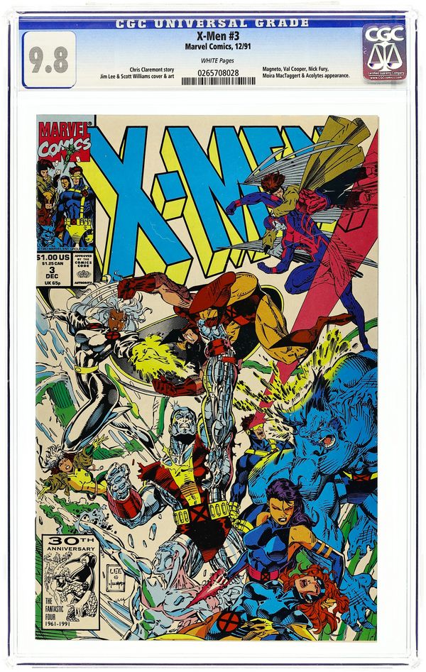 Cover pencils by Jim Lee, inks by Scott Williams. Fallout!, script by Jim Lee (Co-Plot) and Chris Claremont, pencils by Jim Lee, inks by Scott Williams; Cortez betrays his master and Asteroid M is destroyed with the X-Men escaping just in time. Cover price $1.00. Grade: CGC 9.8 explanation of grade Condition: Used (collectible)