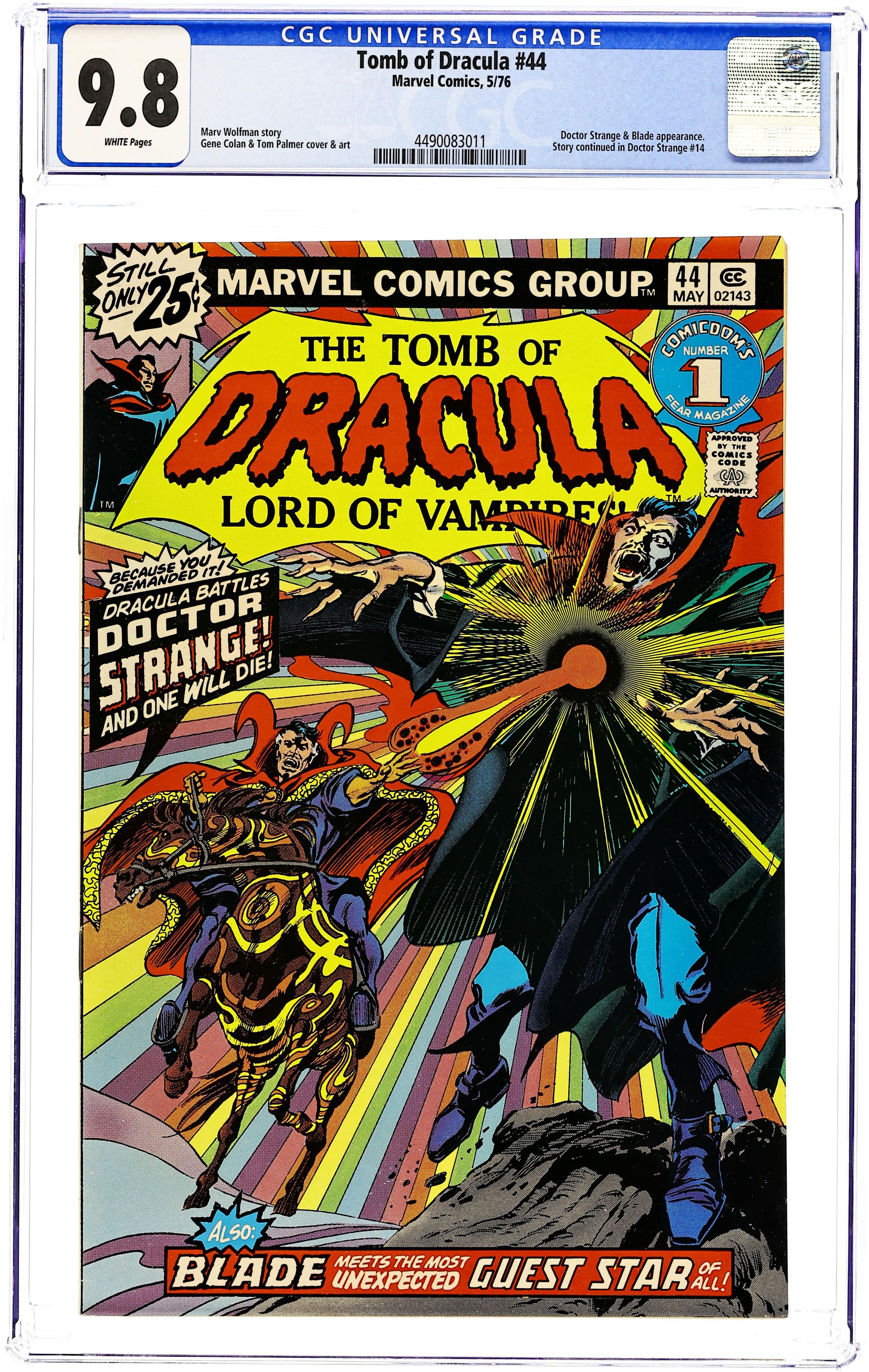 Doctor Strange guest stars in "His Name is Doctor Strange." Script by Marv Wolfman, pencils by Gene Colan, inks by Tom Palmer. The story continues in Doctor Strange 14. Brief Blade appearance; Hannibal King cameo. The letters page contains Marvel Value Stamp series # 80. Colan/Palmer cover. Cover price $0.25. Grade: CGC 9.8 explanation of grade Condition: Used (collectible)