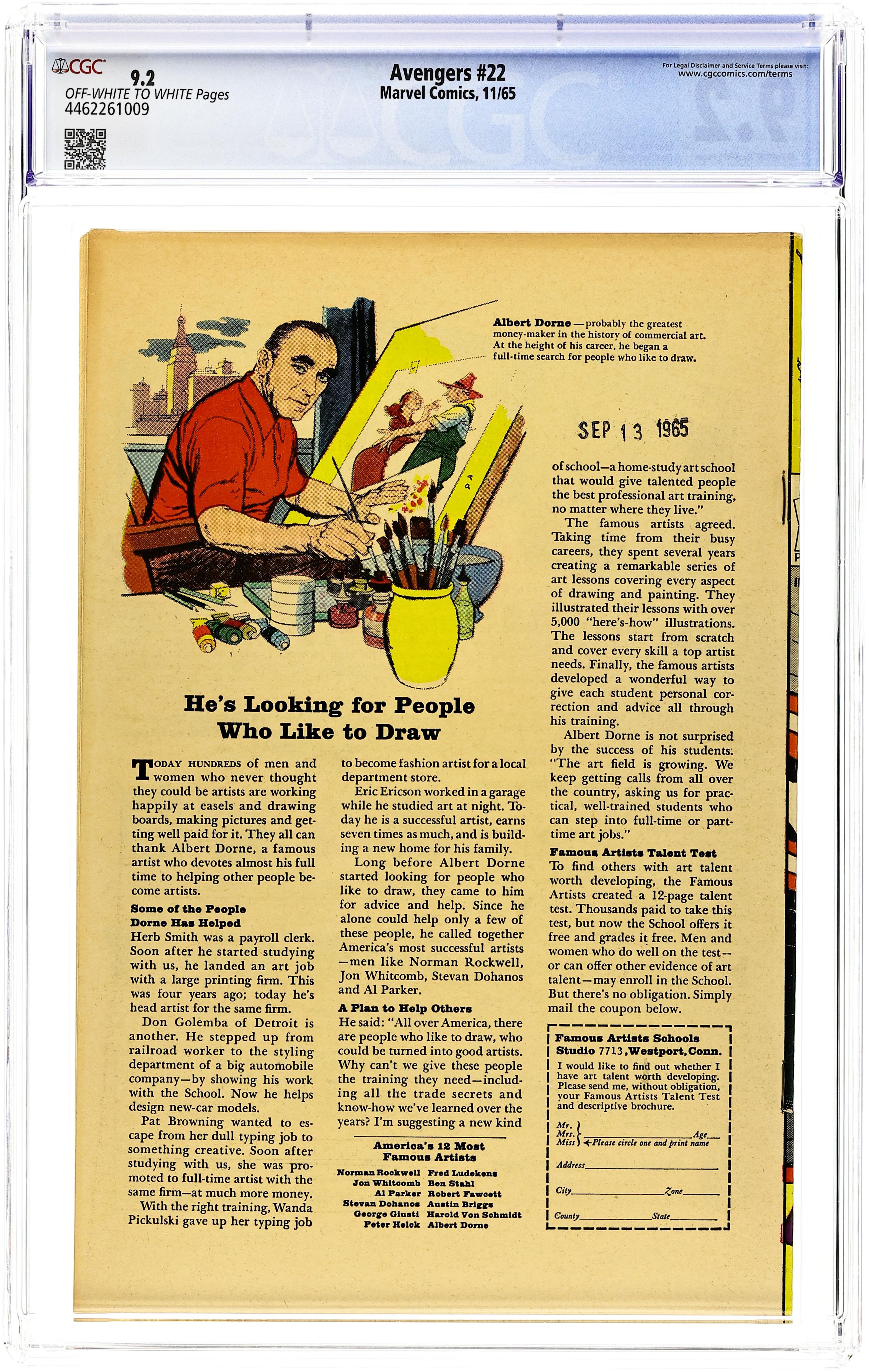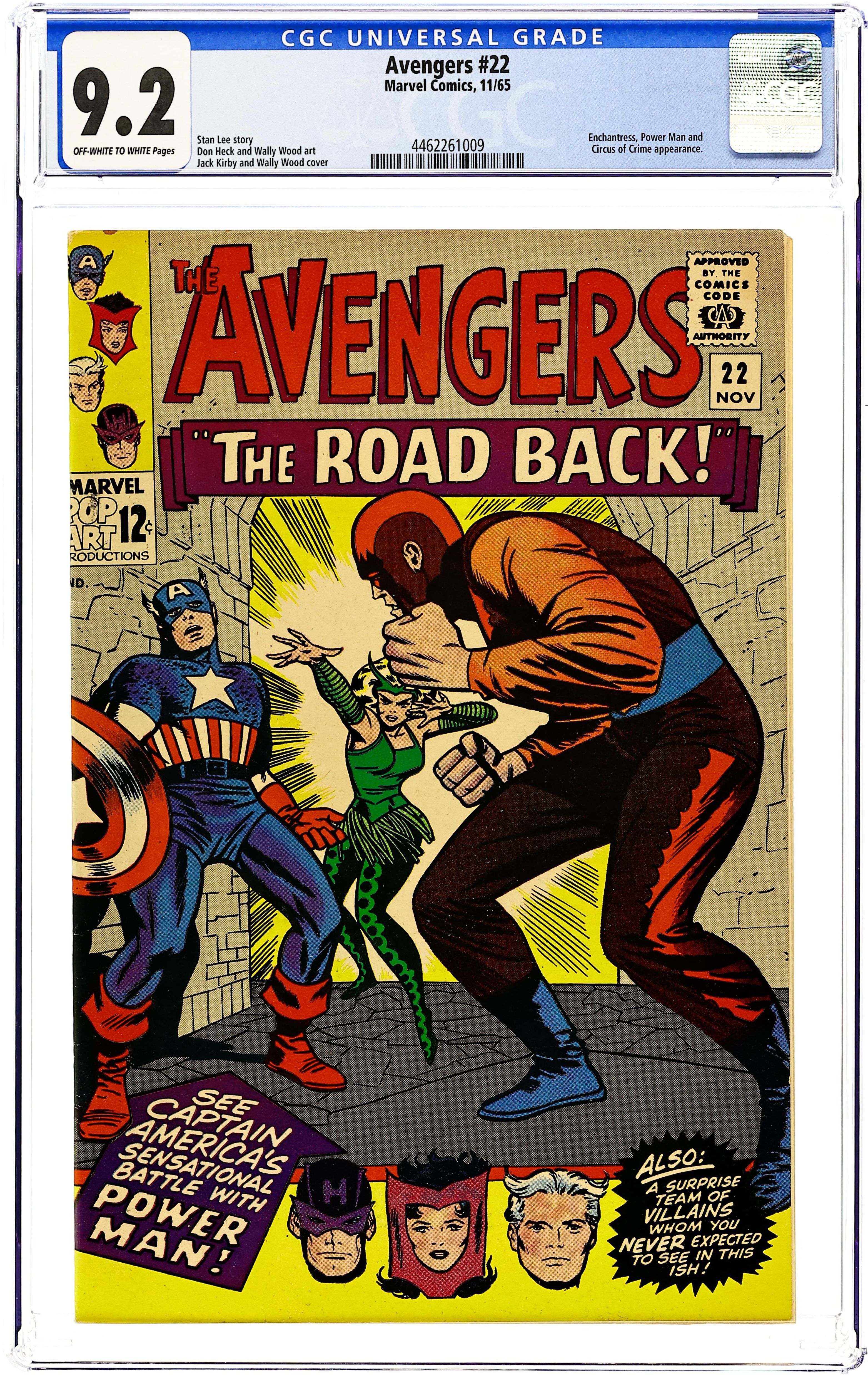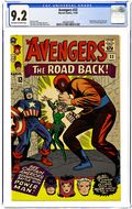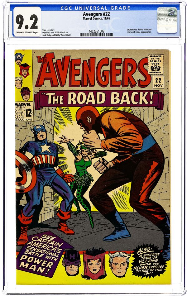 Cover pencils by Jack Kirby, inks by Wally Wood (vignettes by Don Heck and Dick Ayers/Frank Giacoia). "The Road Back," script by Stan Lee, pencils by Don Heck, inks by Wally Wood; Forced to disband the Avengers, Hawkeye, Quicksilver, and Scarlet Witch cannot find work until the Ringmaster hires them; Unable to control them, he tells the police that they tried to rob his Circus; Suddenly the three are on the run; Working on his own, Cap is able to pin the whole scheme on Enchantress and Power Man; Enchantress bails back to Asgard; Power Man, deprived of his lady love, surrenders; The City Council withdraws its order: the Avengers may assemble again. Avengers Roll Call: Captain America (leaves Avengers at end of story), Hawkeye, Quicksilver, and Scarlet Witch. Villains: the first Power Man (Erik Josten), the Enchantress, the Ringmaster, Princess Python, the Clown, Cannonball, Luigi Gambonno, Ernesto Gambonno, and Bruto the Strongman. Cameos by the Mad Thinker's "awesome" Android, Iron Man, Thor, and Giant Man. Reprinted in Marvel Triple Action #16. 36 pgs., full color. $0.12. Cover price $0.12. Grade: CGC 9.2 explanation of grade Condition: Used (collectible)