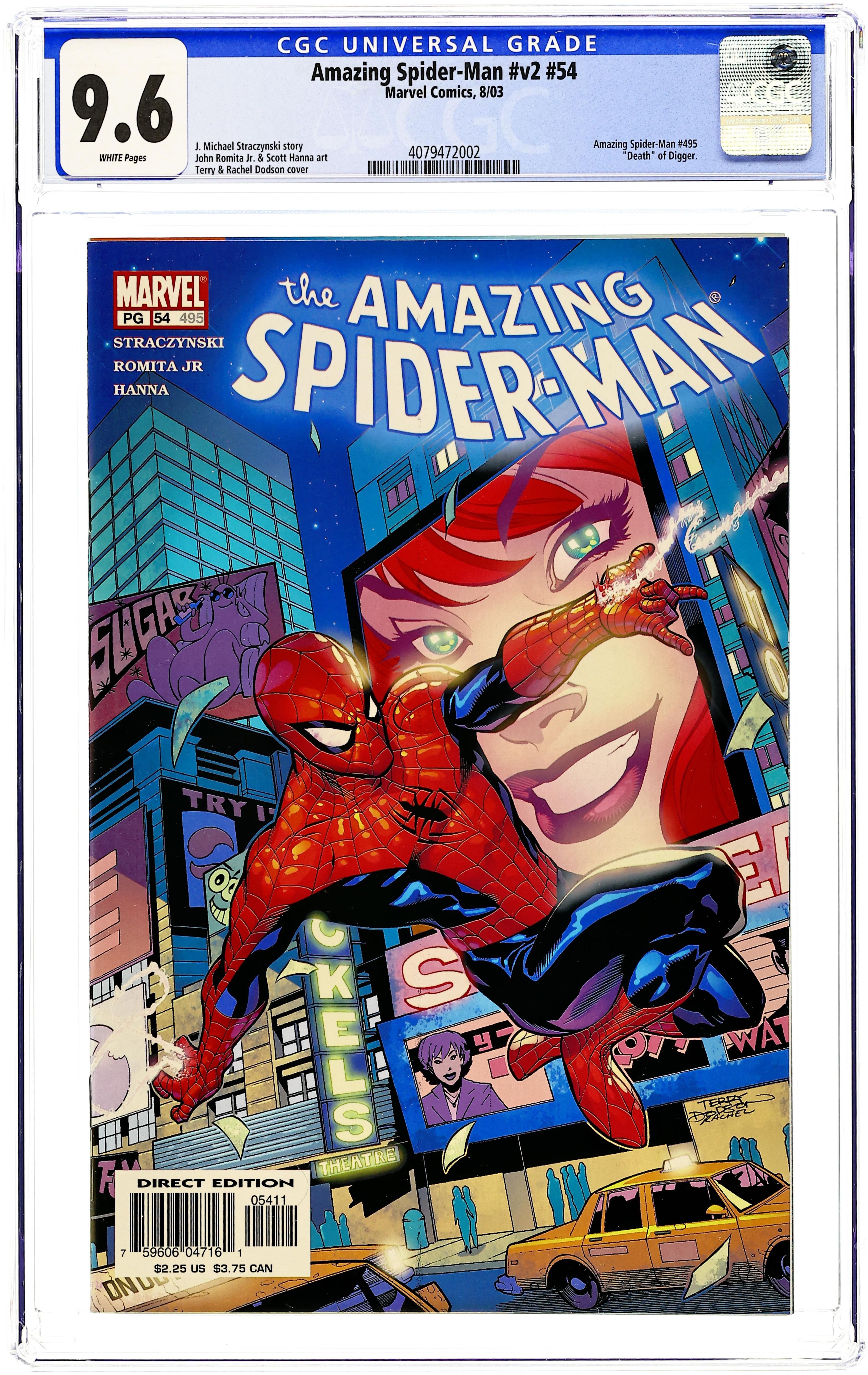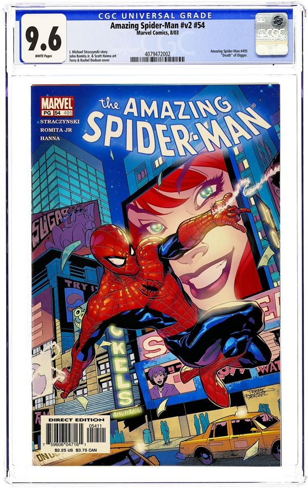 Ended Jun 10 2025 Winning Bid $22 Cover by Terry Dodson. "The Balancing of Karmic Accounts," script by J. Michael Straczynski, pencils by John Romita, Jr., inks by Scott Hanna; Armed with a way to take Digger down, Spider-Man and Lieutenant William Lamont put his idea to the test; Spidey attacks Digger, chasing him into the sewer; Also, Spidey has a little surprise for his new boss, Morris Forelli. 44 pgs., $2.25. Cover price $2.25. Grade: CGC 9.6 explanation of grade Condition: Used (collectible)