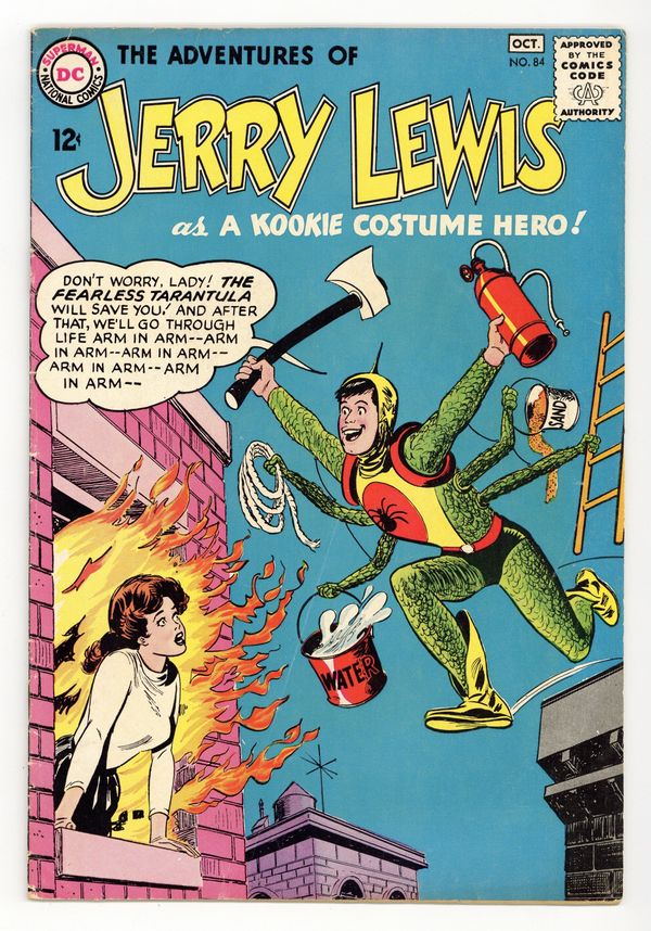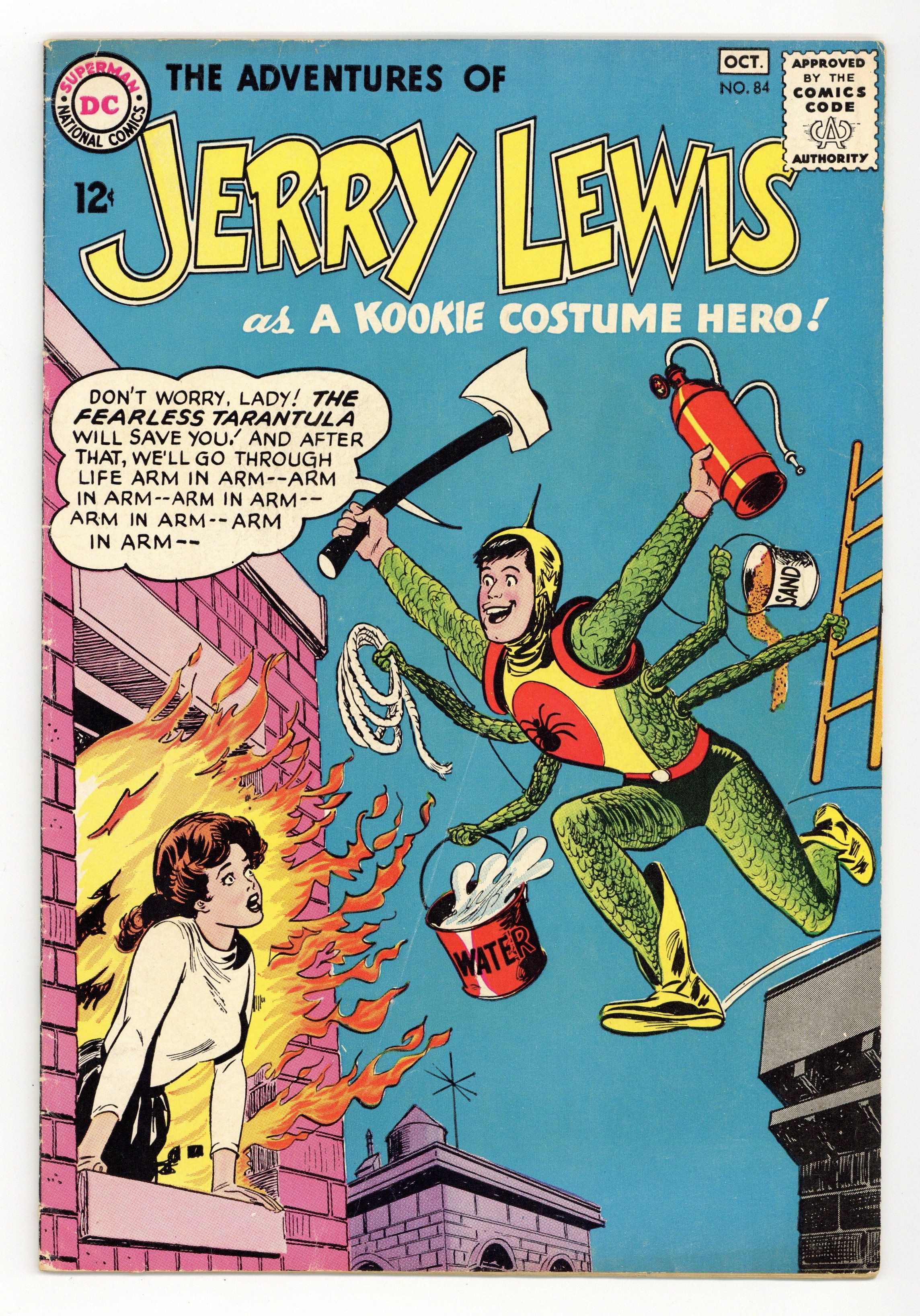 Fearless Tarantula! - Written by Arnold Drake. Art by Bob Oksner. Cover by Oksner? Jerry Lewis as the Fearless Tarantula, a kookie costumed hero, in a 3-part tale! Also starring Dr. Cy Klopps, Uncle Wendell and Patricia Wendell. Plus: Ollie untitled quarter-pager. And: A Letter from Jerry. 32 pages, full color. Cover price $0.12. Grade: VG 4.0 explanation of grade Condition: Used (collectible)