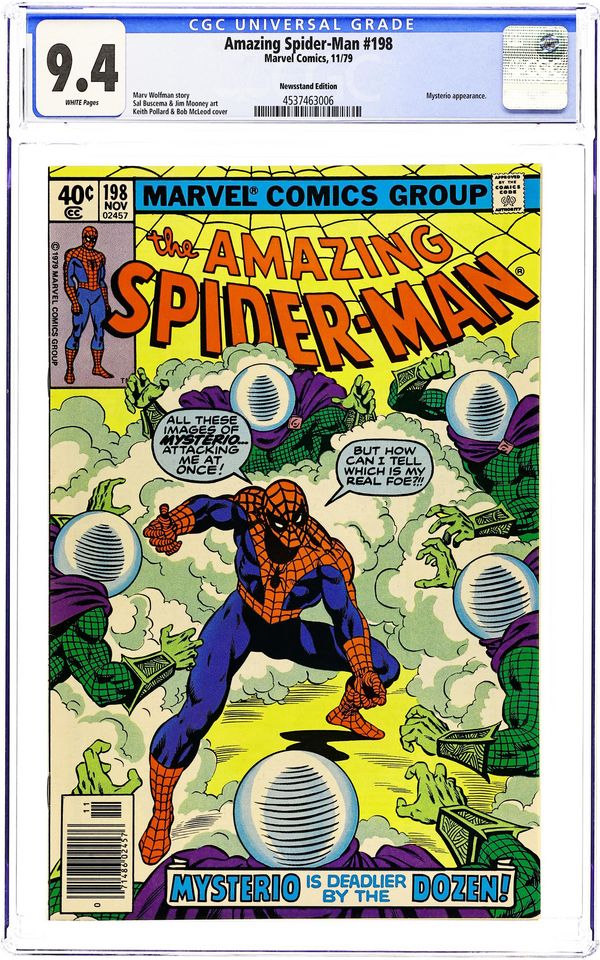 Newsstand Edition. "Mysterio is Deadlier by the Dozen!" Part 1 of 2. Script by Marv Wolfman. Art by Sal Buscema (layouts) and Jim Mooney (finishes). Cover by Keith Pollard and Bob McLeod. At last the web-slinger arrives at Restwell Nursing Home to investigate his aunt's "apparent" death! The spectacular one anticipates a hard-hitting clash with his old adversary, but the Master of Illusion is at the top of his game! Spidey can't lay a glove on Mysterio! Perception trumps reality for your friendly neighborhood Spider-Man! Appearances by Dr. Marla Madison, J. Jonah Jameson, and the burglar. Flashback cameo by the second Mysterio (aka Danny Berkhart). (Notes: Spider-Man previously clashed with the original Mysterio in Amazing Spider-Man 66 & 67. The wall-crawler battled the second Mysterio in Amazing Spider-Man 141 & 142.) 36 pages. Cover price $0.40. Grade: CGC 9.4 explanation of grade Condition: Used (collectible)