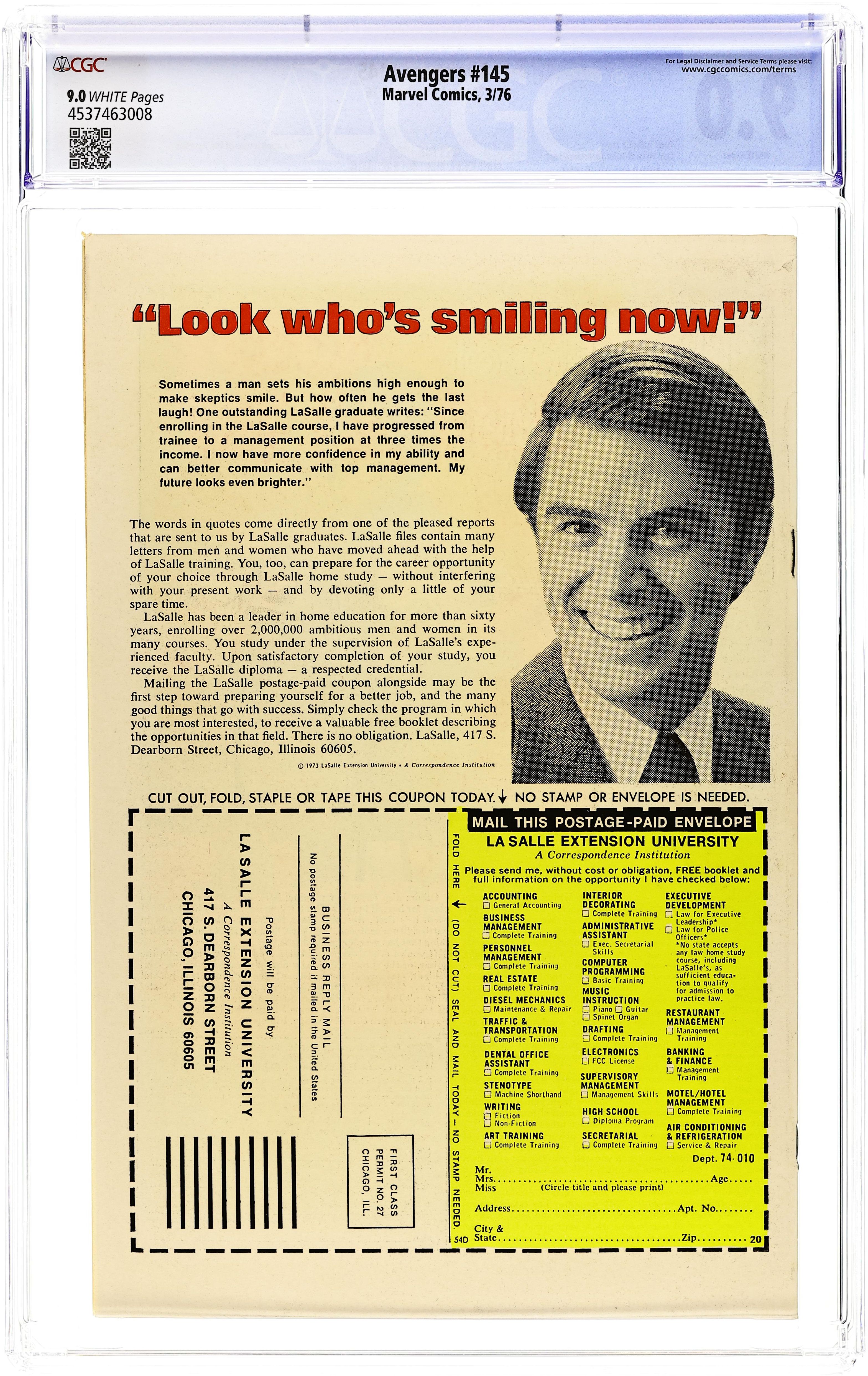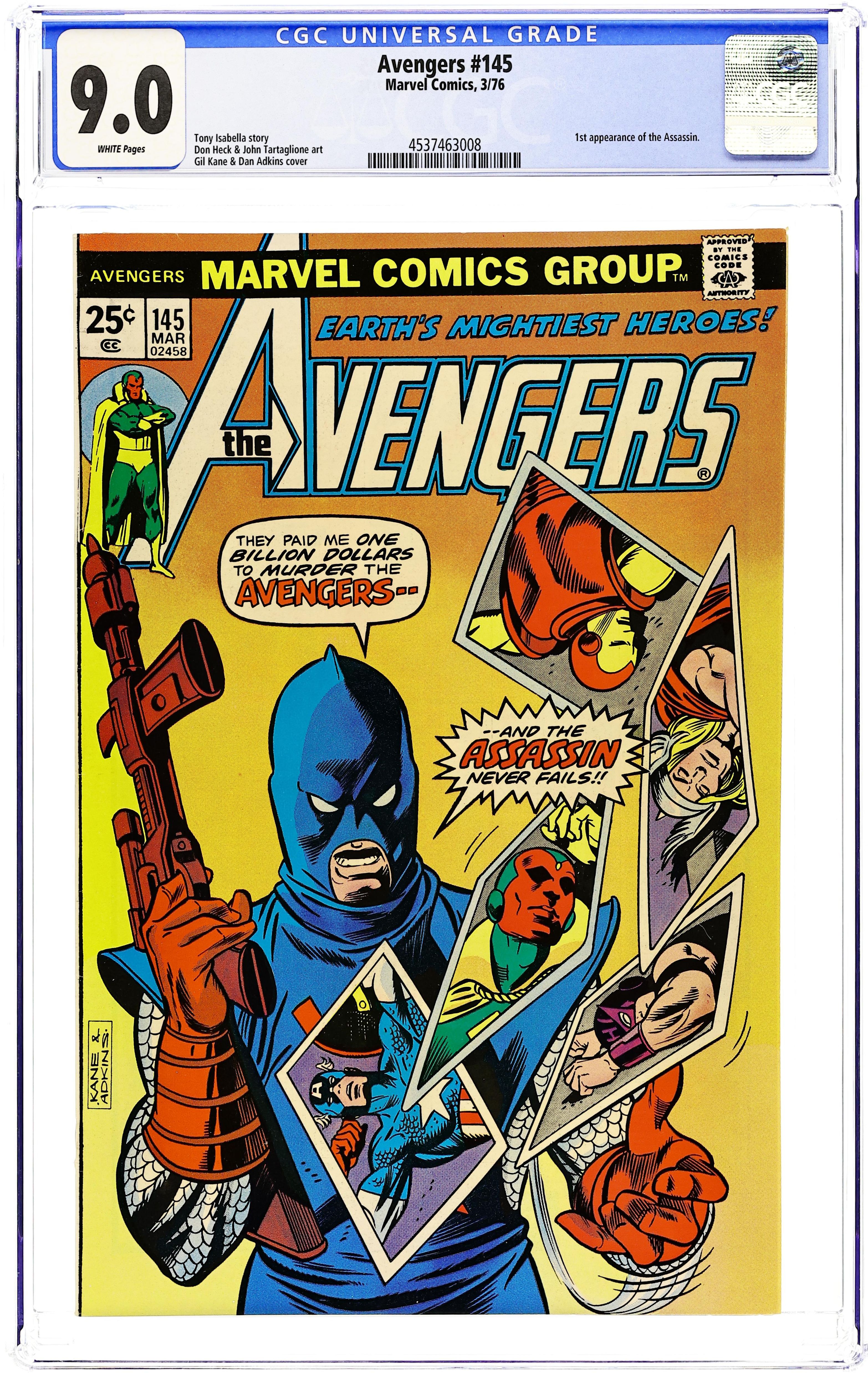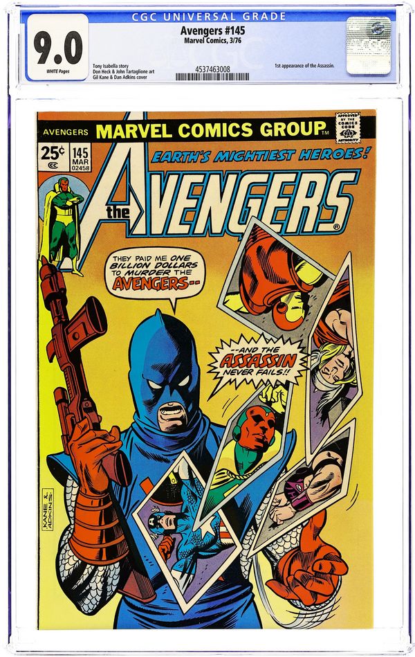 Ended May 14 2025 Winning Bid $31 "The Taking of the Avengers!" Part 1 of 2. Script by Tony Isabella and Scott Edelman. Pencils by Don Heck. Inks by John Tartaglione. Cover by Gil Kane and Dan Adkins. The Avengers series takes a two-issue hiatus from the Squadron Supreme saga. A mysterious elderly man hires the Assassin to kill Earth's Mightiest Heroes! How is a lone gunman going to take down the Avengers? He starts with an ambush of Captain America! And then sets a trap at the hospital for the shield-slinger's teammates! Avengers Lineup: Beast, Captain America, Hawkeye, Iron Man, Scarlet Witch, Thor, and the Vision. Flashback cameos by the Grim Reaper, Magneto, Space Phantom, and Zzzax. (Note: This issue includes a full-page ad for Hostess Cupcakes featuring Mary Jane Watson and Spider-Man vs. Man-Mountain Marko.) 36 pages Cover price $0.25. Grade: CGC 9.0 explanation of grade Condition: Used (collectible)