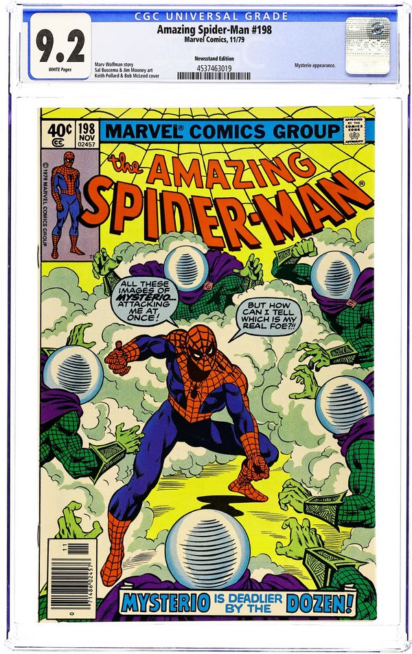 Newsstand Edition. "Mysterio is Deadlier by the Dozen!" Part 1 of 2. Script by Marv Wolfman. Art by Sal Buscema (layouts) and Jim Mooney (finishes). Cover by Keith Pollard and Bob McLeod. At last the web-slinger arrives at Restwell Nursing Home to investigate his aunt's "apparent" death! The spectacular one anticipates a hard-hitting clash with his old adversary, but the Master of Illusion is at the top of his game! Spidey can't lay a glove on Mysterio! Perception trumps reality for your friendly neighborhood Spider-Man! Appearances by Dr. Marla Madison, J. Jonah Jameson, and the burglar. Flashback cameo by the second Mysterio (aka Danny Berkhart). (Notes: Spider-Man previously clashed with the original Mysterio in Amazing Spider-Man 66 & 67. The wall-crawler battled the second Mysterio in Amazing Spider-Man 141 & 142.) 36 pages. Cover price $0.40. Grade: CGC 9.2 explanation of grade Condition: Used (collectible)
