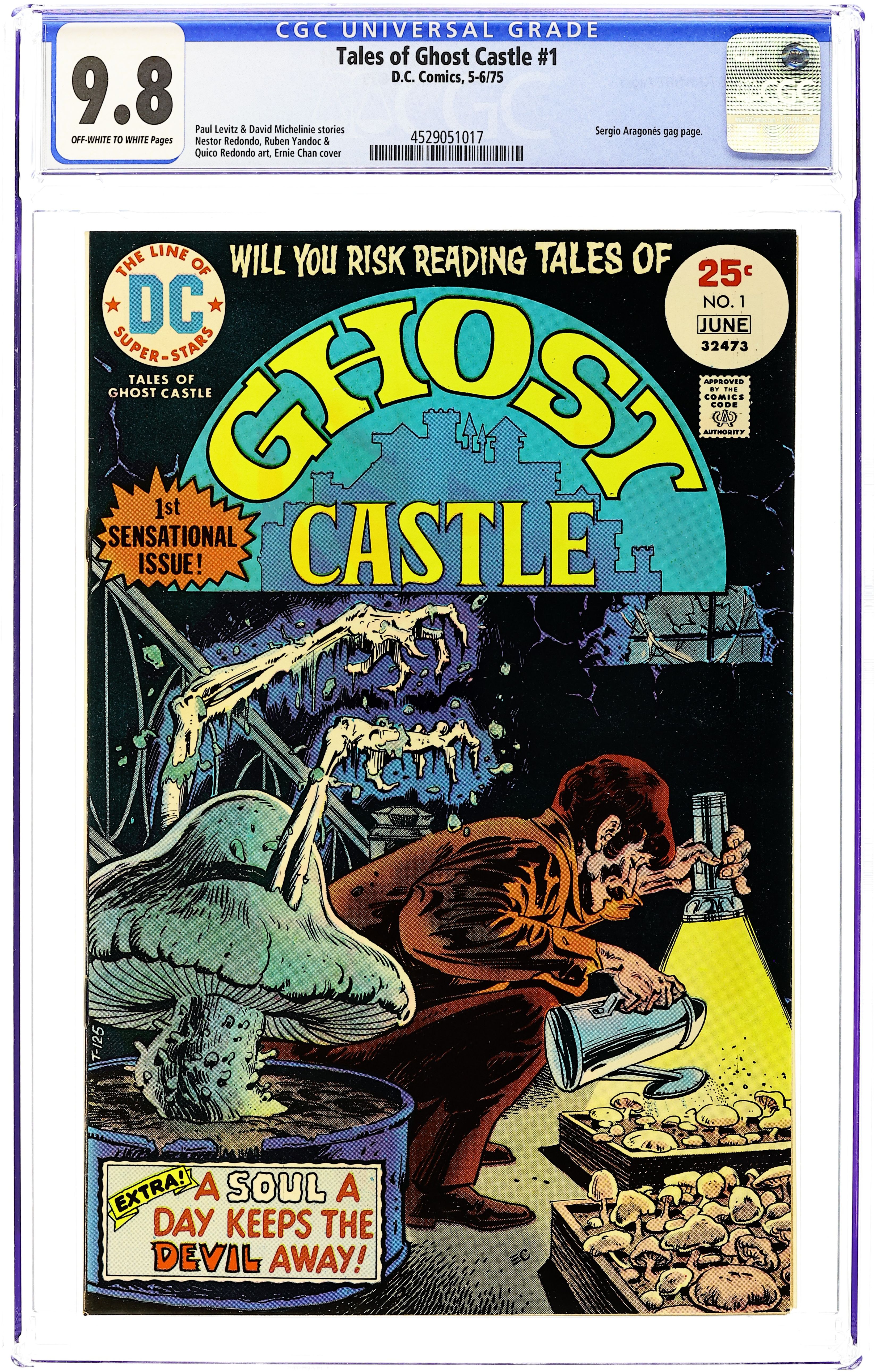 Cover art by Ernie Chan (as Ernie Chua). Framing sequence script by Paul Levitz, art by Nestor Redondo. "A Child's Garden of Graves," script by Paul Levitz, art by Ruben Yandoc (as Rubeny); An adopted girl murders her new brother and sister and buries them in her garden. "A Soul A Day Keeps the Devil Away," script by Paul Levitz, art by Quico Redondo; A demon attempts to get a dentist to barter away his soul in exchange for a life free from work but neglects to take into account how much the dentist enjoys inflicting suffering through his practice. "Ghost Cackles" one-page story by Sergio Aragones. "The Mushroom Man," script by David Michelinie (plot) and Martin Pasko (script), art by Buddy Gernale; A man murders his uncle for money and buries his body under the mushroom patch in the cellar; After a cook prepares a meal with mushrooms she got from the cellar the man is killed when mushrooms burst through his body. 36 pgs., full color. Cover price $0.25. Grade: CGC 9.8 explanation of grade Condition: Used (collectible)