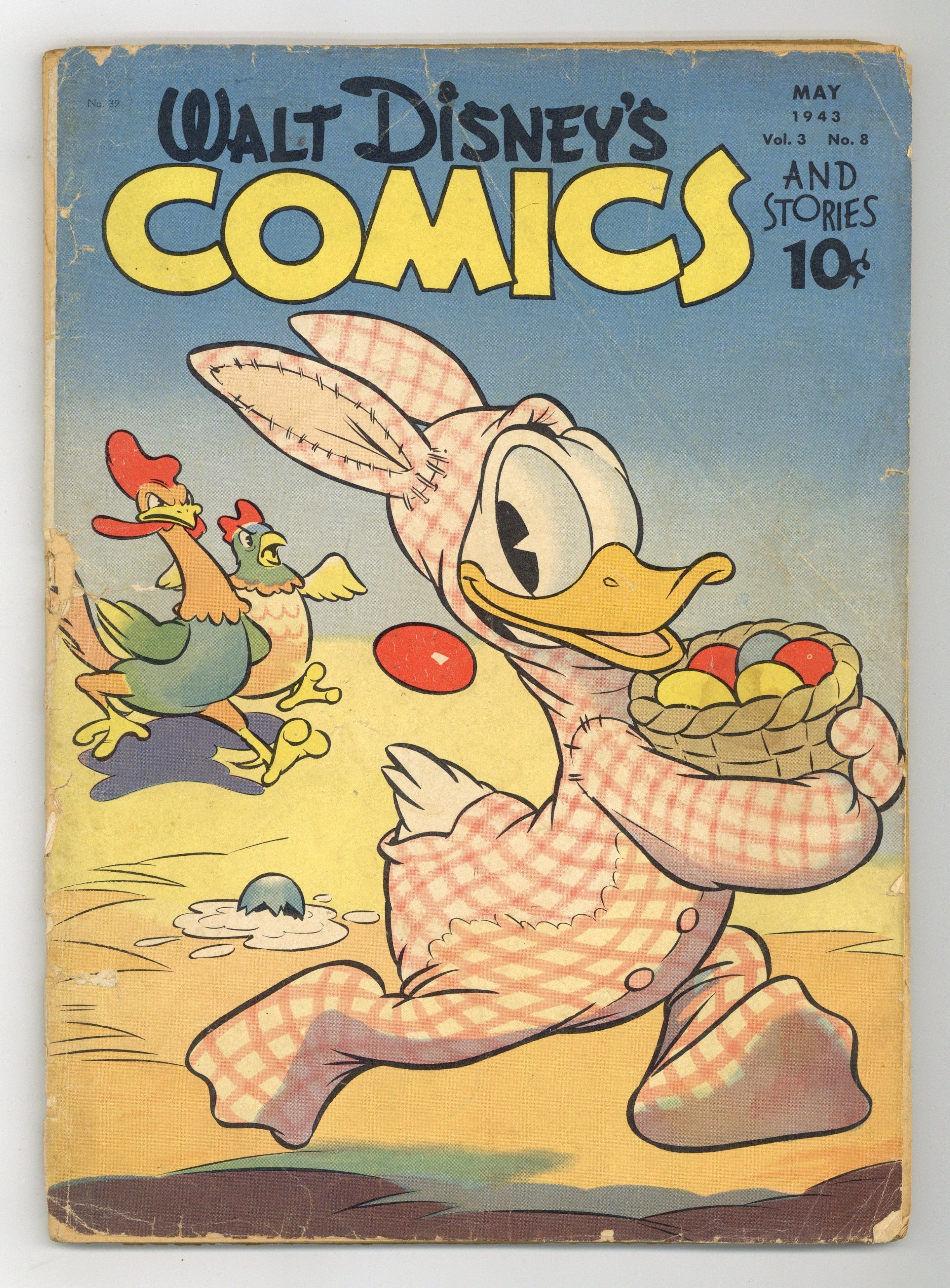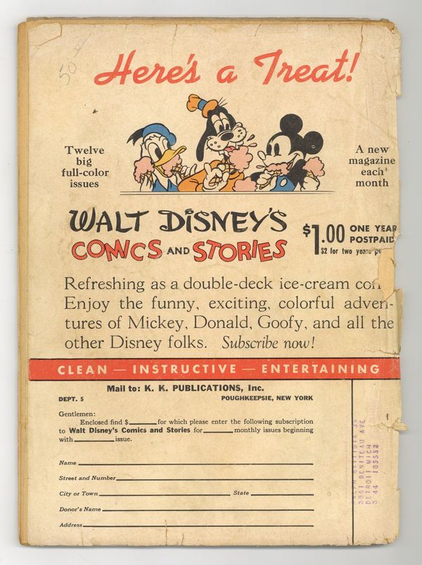 Cover by Carl Buettner. Stories and art by Carl Barks, Floyd Gottfredson, Ted Thwaites, Merrill De Maris, Bob Karp, Hubie Karp, Manuel Gonzales, Bob Wright, Bob Grant, Karl Karpé, and Al Taliaferro. Sometimes listed as Vol. 3 #8. The long-running vehicle for Disney character comics featured early work by Carl Barks, the legendary Good Duck Artist. In a classic Floyd Gottfredson story from the Mickey Mouse comic strip, hotel detective Mickey investigates ghosts in the haunted hotel. In a story by Barks, Donald tests out his nephews' lucky rabbit's foot. In a story referencing WWII resource conservation, Donald must drive by candlelight. Injuity; Lesson Learned; Underdog; Almost; The Twins See the Circus; His Money's Worth; Quiz Kids; Hero; Swindled; All Work; Mickey Mouse, Bellhop Detective; Hollywood Chatter; Why Walk?; Trombone Trouble; Lucky Mickey; And No Charge!; Officer Mickey; At the End of His Rope; An Artist at His Best!; The Prodigal Son Returns; Birds and Beasts; Candle-Power; The Easiest Way; Heads Down!; Another Eternal Triangle; They Give Till It Hurts!; "Nipped" in the Bud!; A Ringer; Boat Builder; Brainwork; Tail Feathers; Portable Bomb Shelter; Chocolate Soldiers; The Last Stretch; Double Duty;Coal Aplenty; The Thief; Take a Load Off Your Feet, Boys!; He's a Lotta Hot Air!; You Asked For It!; No Victory Garden; Toni's Gift; Mickey Mouse Movies; Clear Profit; All the Comforts of Home; A Slight Correction. 64 pages, Full Color. Cover price $0.10. Grade: PR 0.5 explanation of grade Condition: Used (collectible)