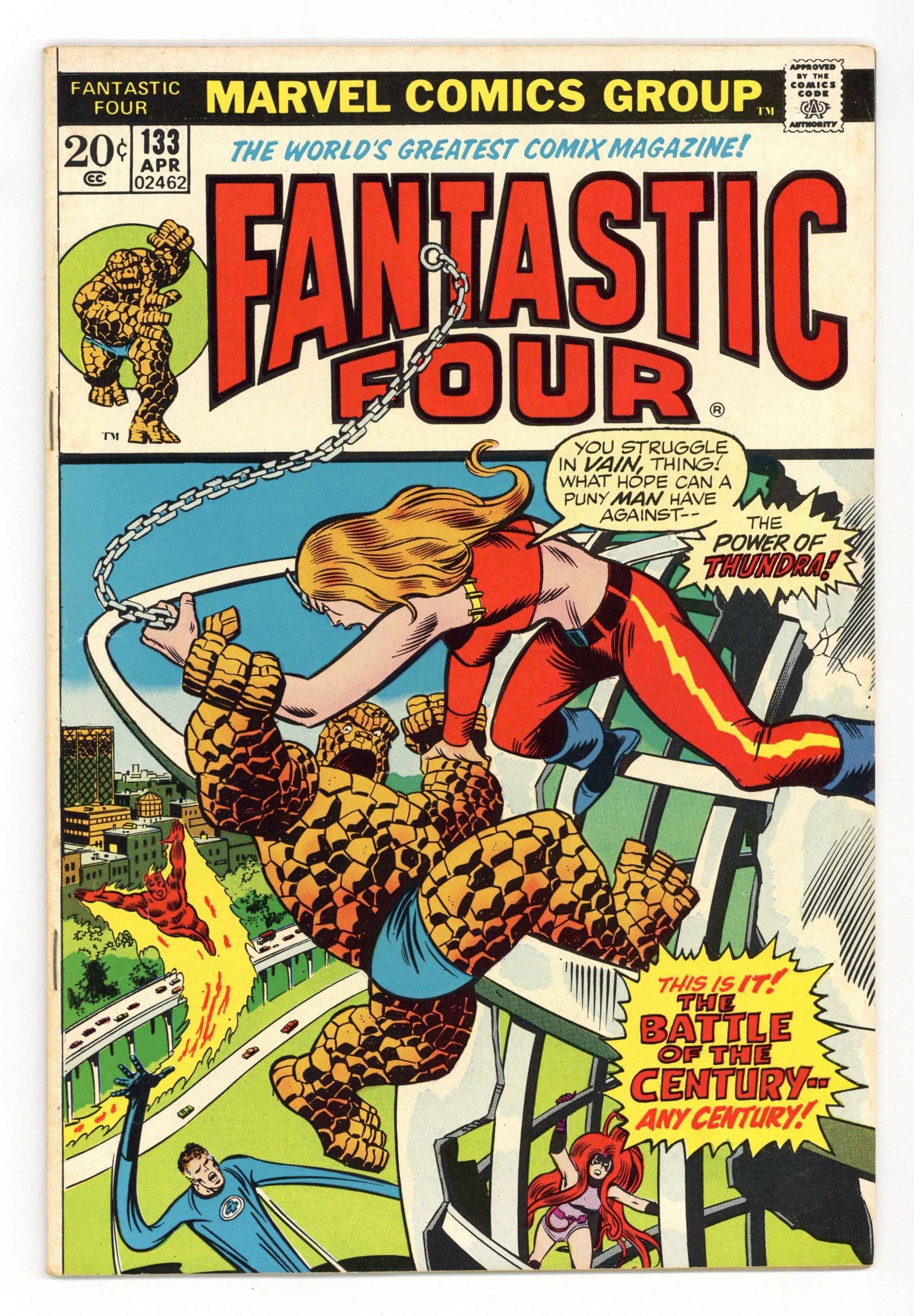 National Diamond Sales Advertisement Insert Variant. "Thundra at Dawn!" Guest-starring Thundra. Plot by Roy Thomas. Script by Gerry Conway. Pencils by Ramona Fradon. Inks by Joe Sinnott. Cover by John Buscema and Joe Sinnott. It's New Year's Eve in Times Square! Everyone is in a celebratory mood, except the Fantastic Four. Affairs of the heart are plaguing both Reed and Johnny, while Ben and his girlfriend Alicia are doing great! However, the Thing's fortunes change in a New York minute, when Thundra dramatically reappears at the stroke of midnight, challenges Ben to a fight, and kidnaps Alicia! What a set of revoltin' developments! The colossal confrontation between the two mighty warriors begins at Shea Stadium and ends at the Unisphere (from the 1964 World's Fair)! Can the blue-eyed idol of millions find the inner strength to bring down (the) Thundra? Cameo appearances by Captain America, the Hulk, Iron Man, Power Man, Spider-Man, Thor, Sandman, Trapster, and Wizard. (Notes: This is one of the very few issues that Ramona Fradon drew for Marvel. Gerry Conway begins his 20-issue scripting run on the Fantastic Four series. Thundra appears next in Giant-Size Super-Stars 1.) 32 pages Cover price $0.20. Cover price $0.20. Grade: VG/FN 5.0 explanation of grade Condition: Used (collectible)