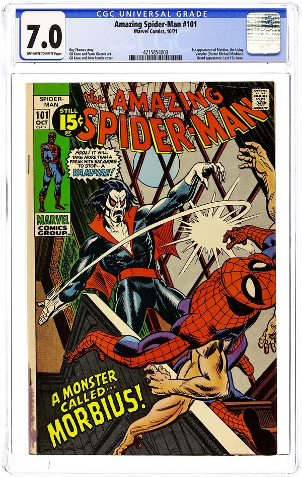 Ended Jun 2 2025 Winning Bid $382 First appearance of Morbius the Living Vampire in "A Monster Called Morbius!" Script by Roy Thomas. Pencils by Gil Kane. Inks by Frank Giacoia. Cover by Gil Kane and John Romita. The first 100 issues of the Amazing Spider-Man title are in the books! And the next chapter in the web-slinger's anthology kicks off with the debut of Marvel's first bronze age vampire: Morbius! However, at the moment Peter Parker has a much bigger problem on his (six) hands. After drinking the special potion he developed, Aunt May's nephew grew four additional arms! Oh, my goodness! Peter is desperate to find a way to remove the arms, so he calls Dr. Curt Connors for help. Dr. Connors has a summer house and laboratory in Southampton on Long Island...and he gives Spider-Man permission to stay there and work on a cure. Meanwhile, a strange, pale, and bloodthirsty man is the sole survivor of a shipwreck near Southampton. And he's looking for a quiet place to rest. Oh no. Is the six-armed Spider-Man on a collision course with a living vampire? Oh yes! Cameo appearances by Gwen Stacy, J. Jonah Jameson, Joe Robertson, and the Lizard. Last 15ยข cover price. (Notes: This is the first issue of the Amazing Spider-Man series not written by Stan Lee. There exists a second printing of this issue published in 1992 with a silver background cover. Marvel also published a facsimile edition of Amazing Spider-Man 101 in 2021.) 36 pages. Cover price $0.15. Grade: CGC 7.0 explanation of grade Condition: Used (collectible)