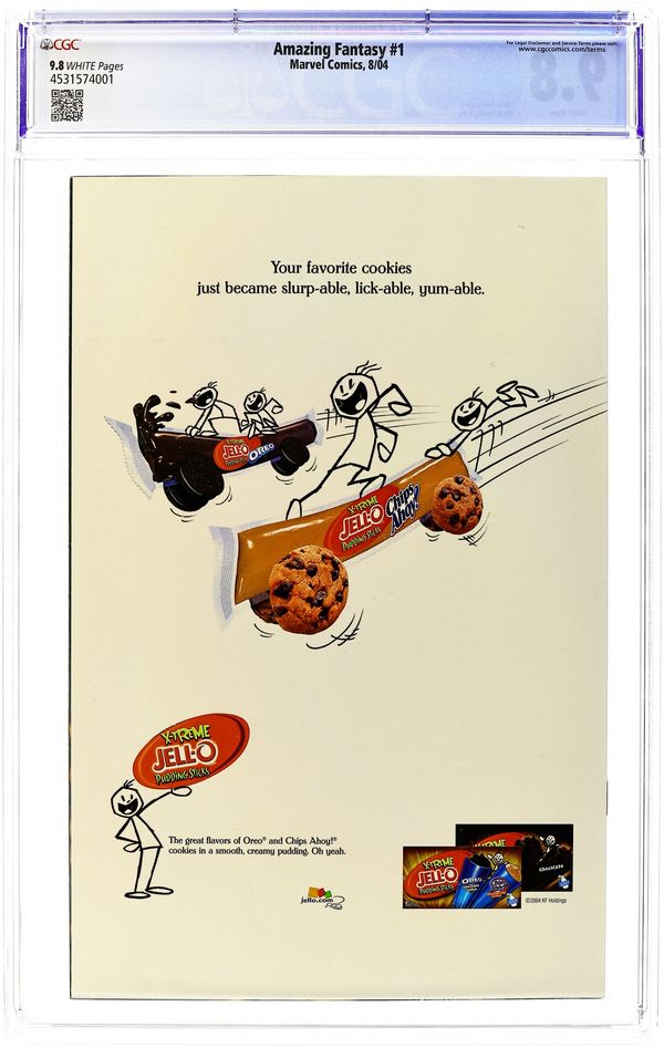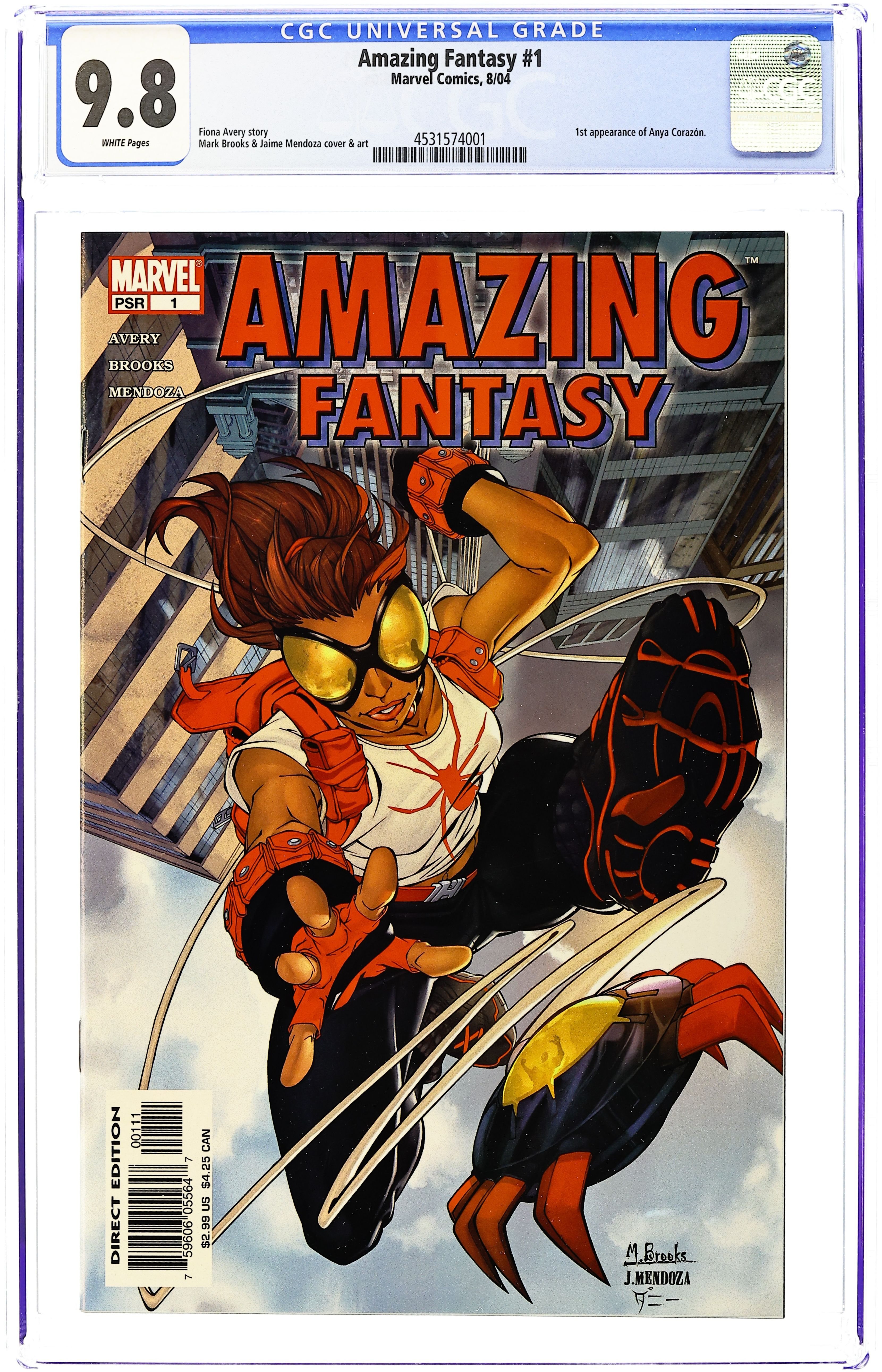 Ended Jul 17 2025 Bid History 13 bids Winning Bid $64 Written by FIONA AVERY Pencils & Cover by MARK BROOKS She's fierce, she's sassy... she sticks to walls! AMAZING FANTASY #1 is where it all begins: Meet an all-new, all-different heroine! Fiona Avery (AMAZING SPIDER-MAN) and Mark Brooks (MARVEL AGE SPIDER-MAN) launch a surprising series of teen- friendly adventures set in the current Marvel Universe! 32 PGS./MARVEL P Cover price $2.99. Grade: CGC 9.8 explanation of grade Condition: Used (collectible)