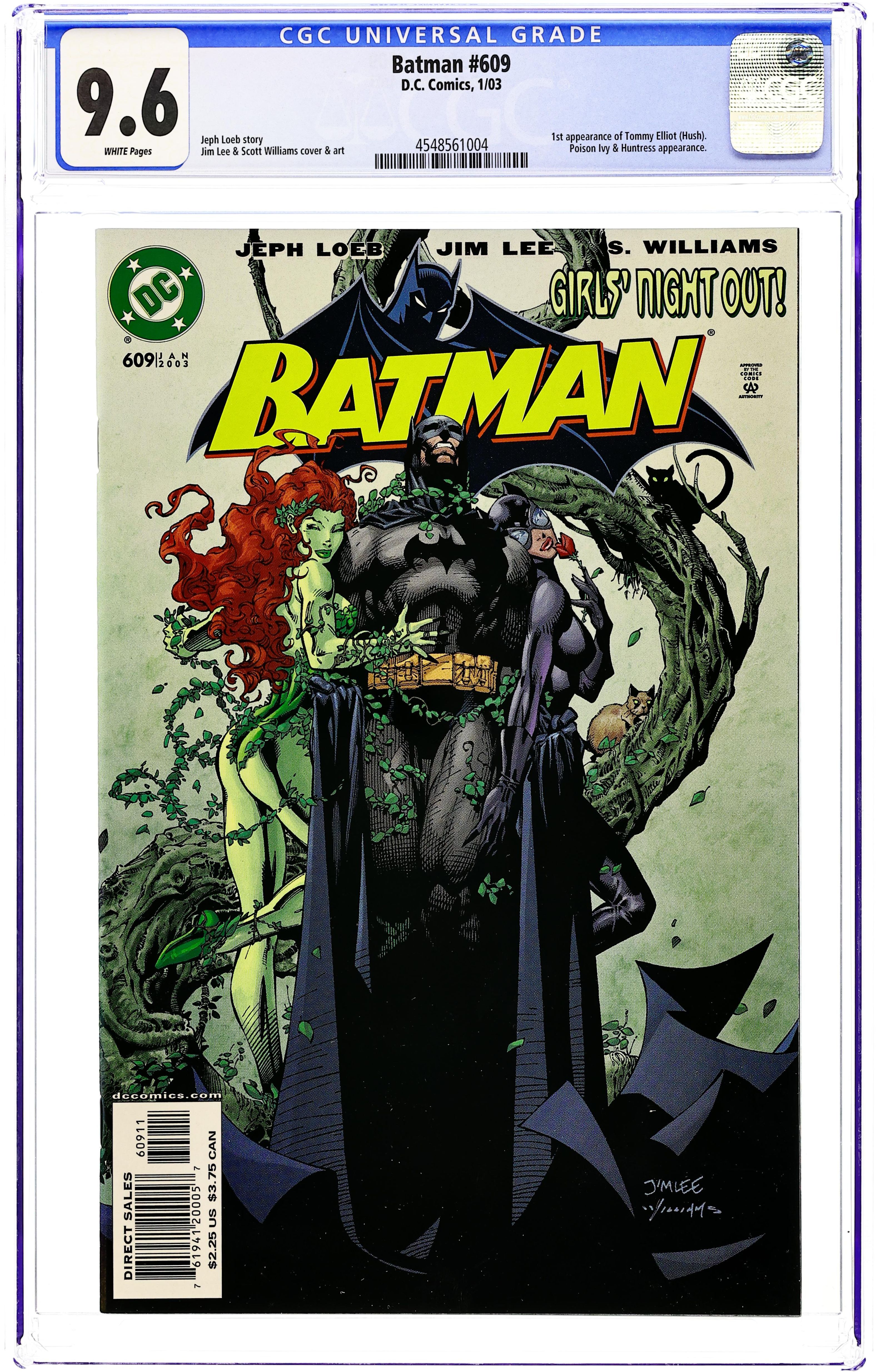 Ended Jun 6 2025 Winning Bid $45 Direct Edition. WRITTEN BY JEPH LOEB; ART AND COVER BY JIM LEE AND SCOTT WILLIAMS In stores November 27. Jeph Loeb & Jim Lee continue their run on BATMAN with Part 2 of the 12-part "Hush." Lying near death, Batman must turn to the least likely person from the Bat family for help: the Huntress! Meanwhile, Catwoman continues to hunt down the mysterious individual responsible for wreaking havoc in their lives ? a path that leads her back to Poison Ivy. 48 Pages, Full Color. Cover price $2.25. Grade: CGC 9.6 explanation of grade Condition: Used (collectible)