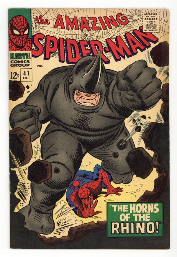 Cover pencils by John Romita Sr., inks by Mike Esposito and John Romita (touch-ups). First appearance of the Rhino in The Horns of the Rhino!, script by Stan Lee, pencils by John Romita Sr., inks by Mike Esposito (as M. Demeo) and John Romita Sr. (touch-ups); The Rhino attempts to kidnap John Jameson to turn him over to foreign powers that want his secrets about the U.S. space program; Spider-Man manages to stop the Rhino. Reprinted in Marvel Tales # 30 and 190. 36 pgs., full color. $0.12. Cover price $0.12. Grade: FN 6.0 explanation of grade Condition: Used (collectible)