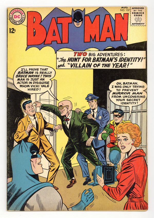 Cover pencils by Sheldon Moldoff, inks by Charles Paris. "The Villain of the Year," script by Dave Wood, pencils by Sheldon Moldoff, inks by Charles Paris; After receiving a tip on a crime from reporter Hal Lake, Batman goes undercover and discovers that Lake is using an underworld alias in order to gather information, is mentally unbalanced, and a criminal called the Jackal. "The Hunt for Batman's Secret Identity," script by Bill Finger, pencils by Sheldon Moldoff, inks by Charles Paris; When Mirror Man escapes from prison and reforms his gang, he once again tries to prove his belief that Batman is Bruce Wayne...and he does...and doesn't! 2/3-page True Crime Laffs by Henry Boltinoff. 36 Pages, Full Color. Cover price $0.12. Grade: VG+ 4.5 explanation of grade Condition: Used (collectible)
