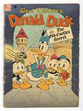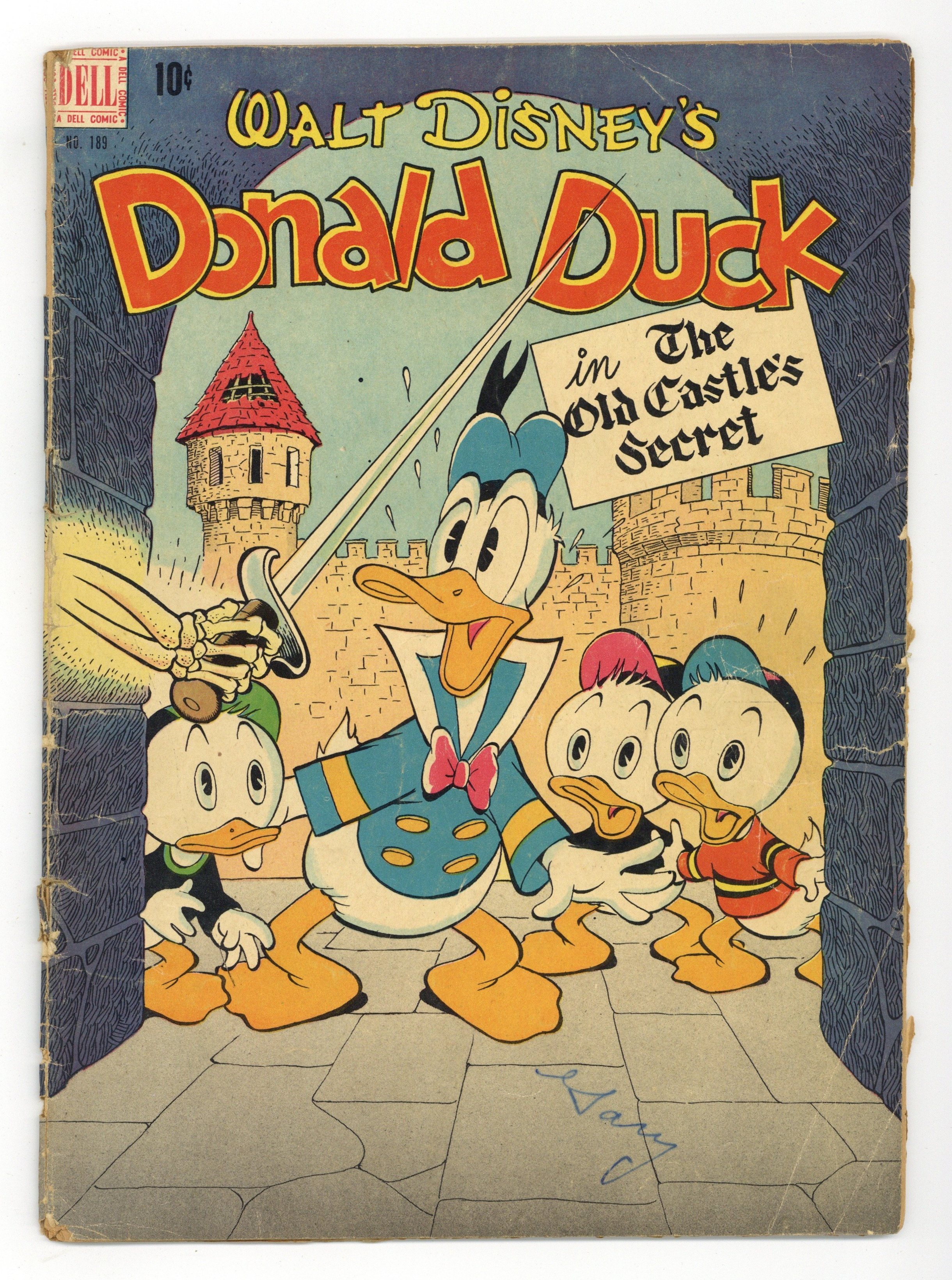 Ended May 31 2025 Winning Bid $51 Indicia title is "Walt Disney's DONALD DUCK IN THE OLD CASTLE'S SECRET, No. 189." Cover art by Carl Barks. The Old Castle's Secret, script and art by Carl Barks; Uncle Scrooge and the ducks go to Scotland to find the treasure hidden in the walls of the old McDuck castle, and there they encounter a "ghost" that is invisible except for the shadow cast by its skeleton; The "ghost" soon steals the treasure and traps the ducks on a balcony a hundred feet above the ground, but the nephews get down safely and find a secret entrance to the castle through an old graveyard. Horseshoe Luck, script and art by Carl Barks; Donald refuses to believe that finding a horseshoe brings good luck. Bean Taken back cover strip by Carl Barks; Donald devises a system for guessing the number of beans in a jar. 36 pages, full color. Cover price $0.10. Grade: FR 1.0 explanation of grade Condition: Used (collectible)