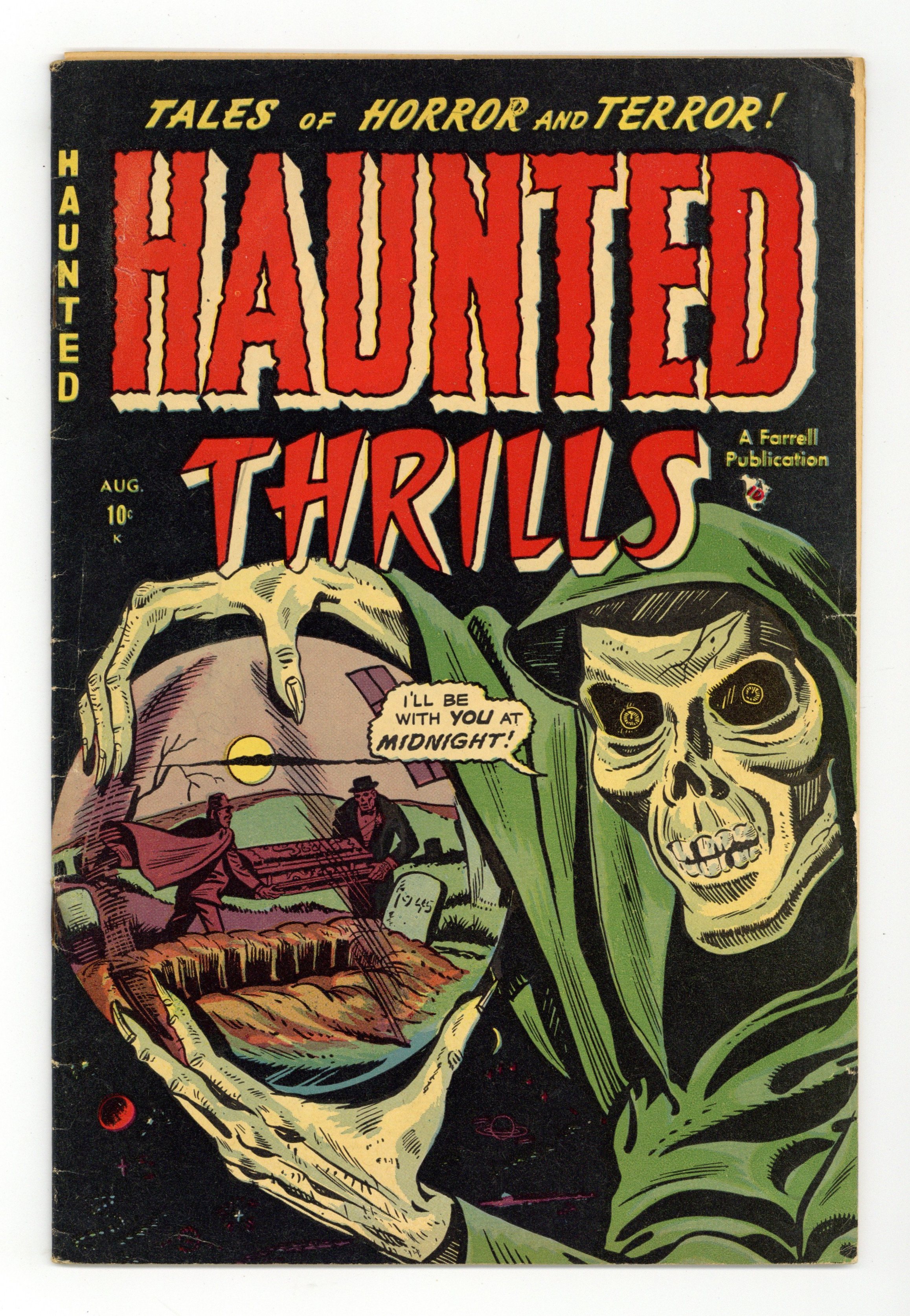 Pre-Code horror comics from Ajax-Farrell and their anonymous talents. Mine workers unearth a tentacled horror from the subterranean depths. Grimm, the Ghost Doctor, investigates when a ghost threatens a gardener and his black rose. The ghost of King John arises to protect the original copy of the Magna Carta. Horror in the Mine!; Blood of the Rose; Tropical Madness; Death Is Only Skin Deep; The Voyager Of Death! 36 pages, Full Color. Cover price $0.10. Grade: GD- 1.8 explanation of grade Condition: Used (collectible)