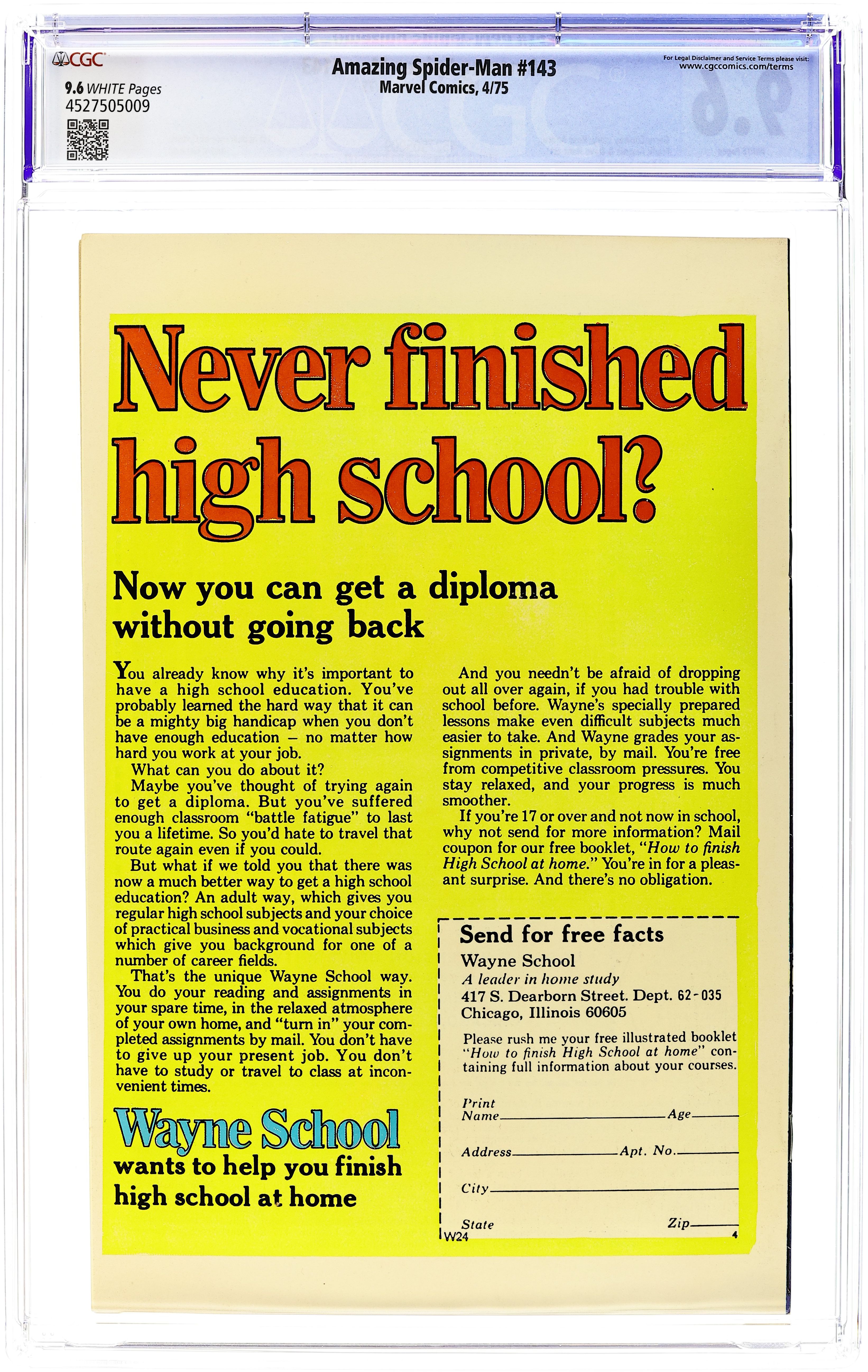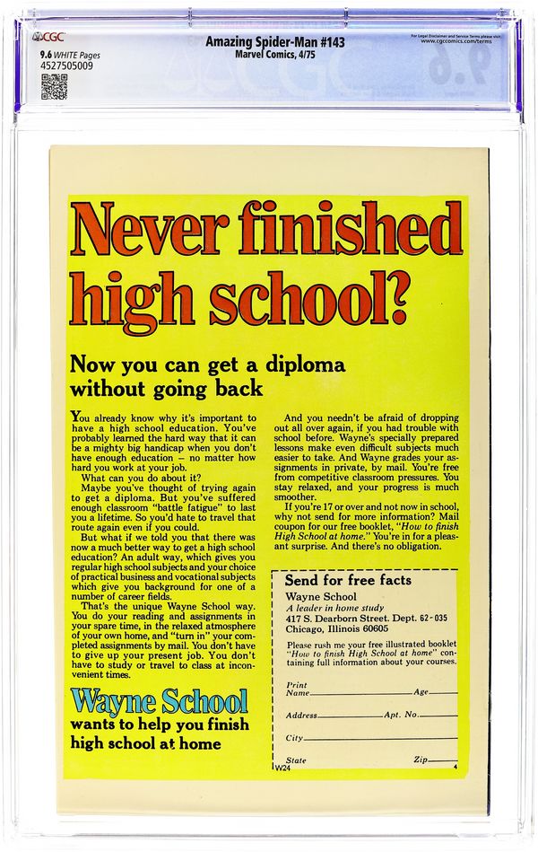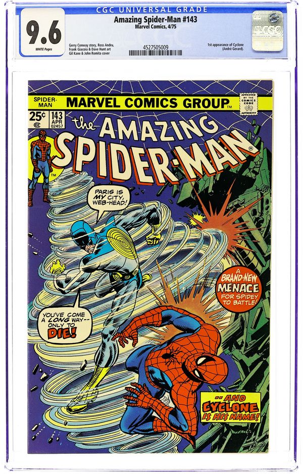 "...And the Wind Cries: Cyclone!" Part 1 of 2. Script by Gerry Conway. Pencils by Ross Andru. Inks by Frank Giacoia and Dave Hunt (backgrounds). Cover by Gil Kane and John Romita. The irrepressible J. Jonah Jameson has been kidnapped in the City of Lights! So Joe Robertson and Peter Parker rush to Paris, France to rescue their boss! The treacherous search for the Daily Bugle publisher leads from the Place Vendôme to the Arc de Triomphe to the Eiffel Tower! Where the Amazing Spider-Man clashes with a new international adversary: The Cyclone! The whirlwind-like villain boasts that he has Jonah! And also, that the web-slinger better meet the ransom demands…or face his own Waterloo! First appearance of the Cyclone. Cameo appearances by Mary Jane Watson, Betty Brant, Flash Thompson, Liz Allan, Professor Miles Warren, and the Gwen Stacy clone. Flashback cameo by Mysterio. (Notes: This issue features the memorable first kiss between Peter and Mary Jane at Kennedy Airport. The letters page includes a letter from comics publisher Dean Mullaney. Giant-Size Spider-Man 4 featuring the third appearance of the Punisher was also published this month. This story was reprinted in Marvel Tales 120.) 36 pages. 25c cover price. Cover price $0.25. Grade: CGC 9.6 explanation of grade Condition: Used (collectible)