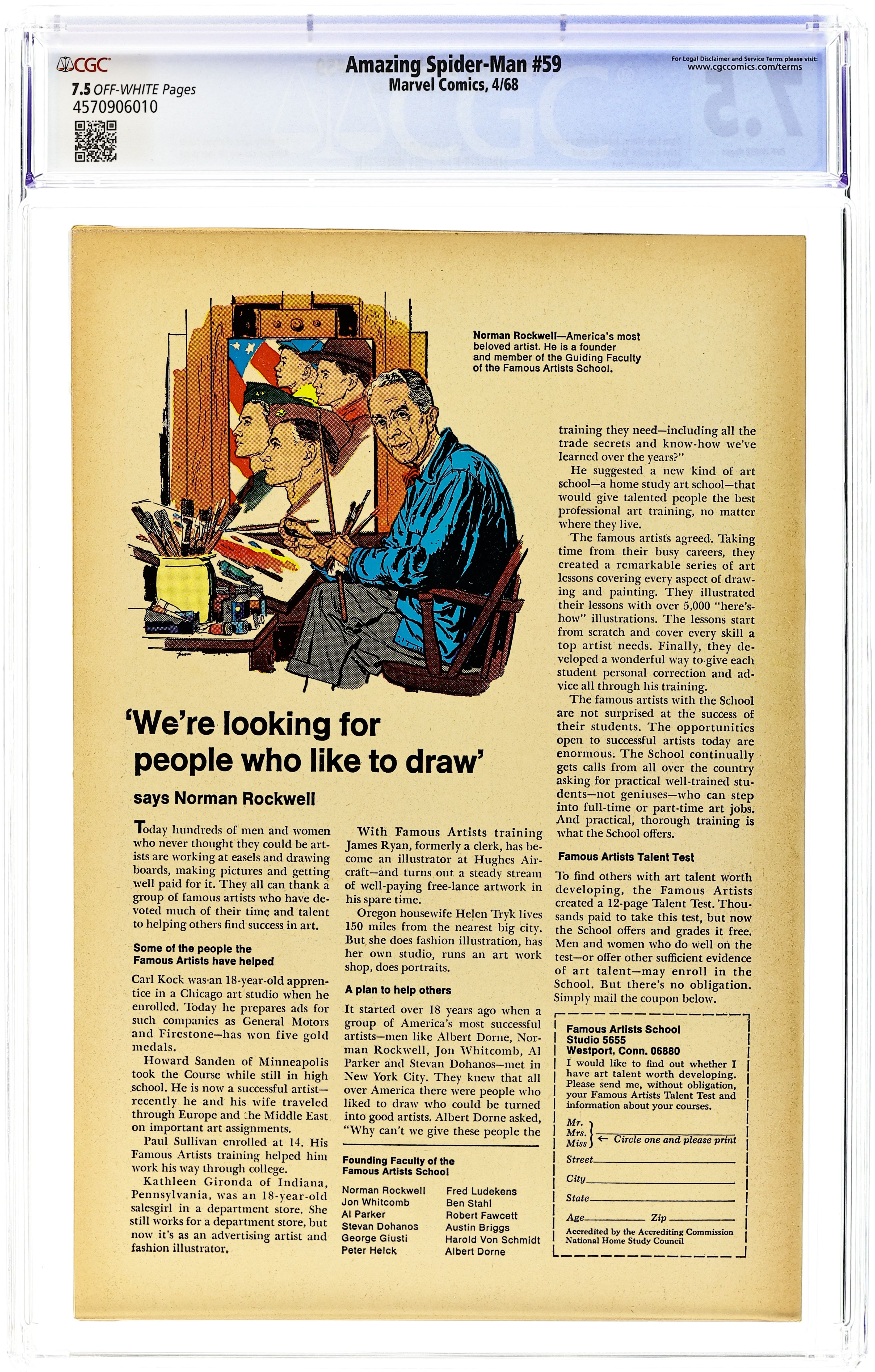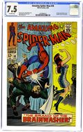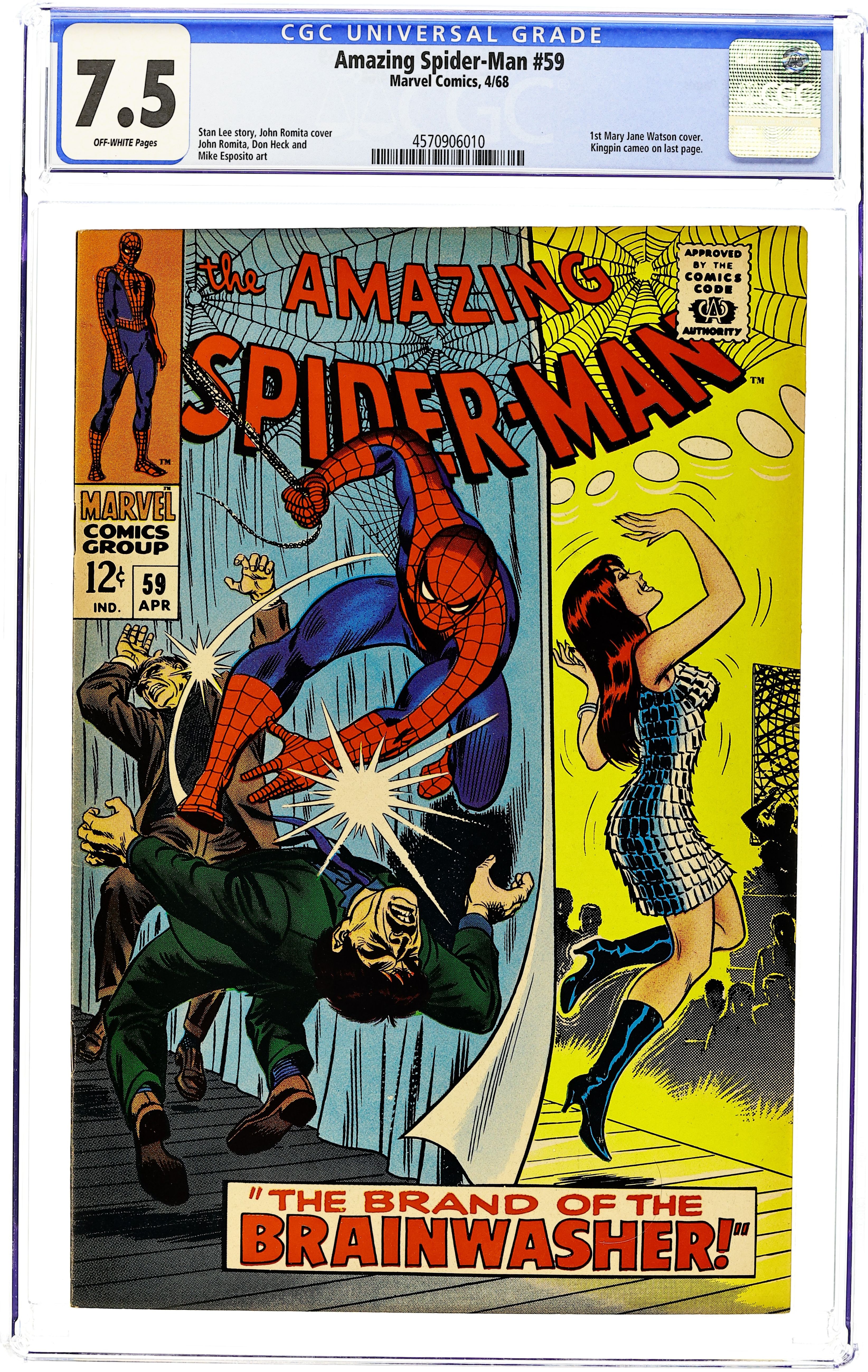 First cover appearance of Mary Jane Watson in "The Brand of the Brainwasher!" Part 1 of 3. Script by Stan Lee. Art by John Romita (layouts) and Don Heck (pencils). Inks by Mike Esposito (as Mickey Demeo). Classic cover by John Romita. Mary Jane has a new job as a go-go dancer at the Gloom Room nightclub! And for MJ's opening night many of her friendsand city officials -- including Captain George Stacy -- attend the show. Interestingly, Mary Jane has a second task for the evening: take pictures of the club's guests with a special camera. After MJ snaps a photo of Gwen's father, he begins acting strangely and then disappears! Who is the owner of this nightclub by the way? Peter suspects that something is amiss, so he quickly changes clothes and swings into action! The night began with Peter Parker on a date with Gwen Stacy...and ends with the Amazing Spider-Manrescuing Mary Jane Watson! A fun issue! Cameo appearances by Aunt May, Harry Osborn, and the Kingpin. (Notes: This story was reprinted in Marvel Tales #42. This issue includes a statement of ownership: average print run: 587,213; average paid circulation 361,663.) 36 pages. Cover price $0.12. Grade: CGC 7.5 explanation of grade Condition: Used (collectible)