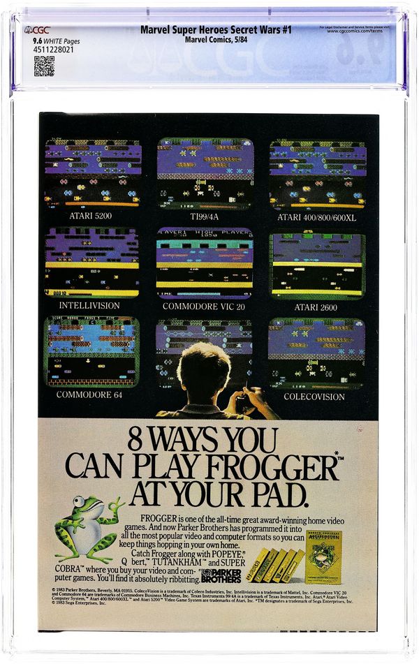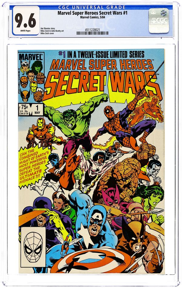 Direct Edition. "The War Begins!" Part 1 of 12. Story by Jim Shooter. Art by Mike Zeck and John Beatty. This is it, the granddaddy of all epic events. Before Identity Crisis, Infinite Crisis, House of M, Civil War, and Infinity Gauntlet there was Secret Wars. A nigh omnipotent being from beyond has, for lack of a better word, kidnapped the greatest heroes and deadliest villains in the Marvel Universe and whisked them to the far side of the universe to battle for the ultimate prize. One thing is for certain, the lives of these heroes and villains will never be the same again. - This is the first printing. Any 2nd printing will have the words "Second Printing" at the bottom of the first page. NOTE: Nearly all first printings contain a "Blue Galactus" from a printing error (a lack of magenta printing plates) that was corrected in later printings. While small number of First printings may have the correct colors, the majority of copies will have "Blue Galactus". Due to the frequency, "Blue Galactus" variants should be treated the same as other First Printings. 36 pages, full color. Cover price $0.75. Grade: CGC 9.6 explanation of grade Condition: Used (collectible)