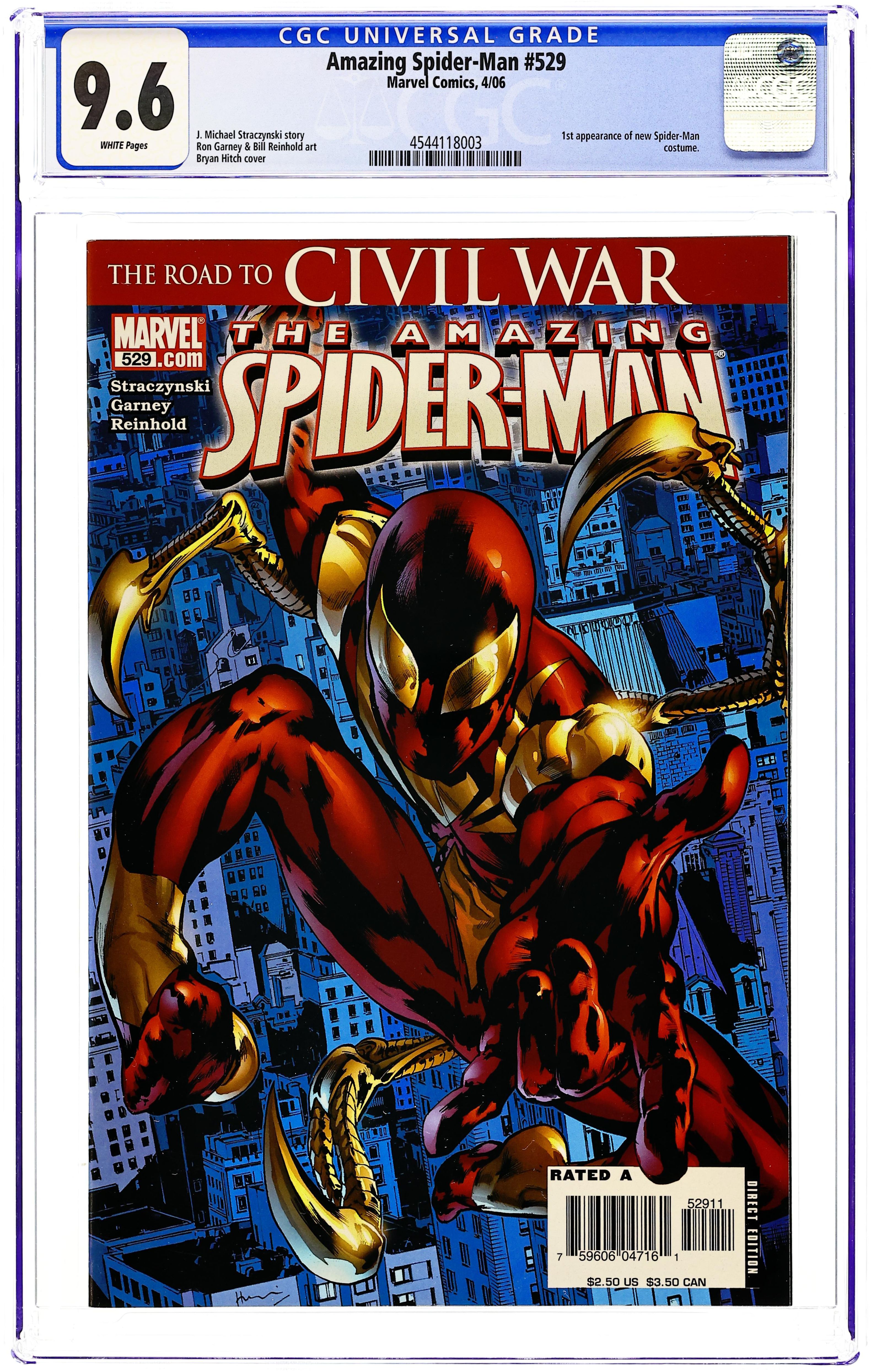 Ended Jun 10 2025 Winning Bid $45 Direct Edition. $2.50 cover price. Written by J. MICHAEL STRACZYNSKI. Pencils by RON GARNEY. Cover by BRYAN HITCH. Clothes make the man. At least that's what Tony Stark seems to think. Transformed by his experiences during "The Other" saga, Peter Parker stands poised for the next chapter of his life. And to mark the occasion, Tony has got a very special present: a new Spider-Man costume that's certain to raise eyebrows! Check out the new costume in this issue! 36 pgs. Cover price $2.50. Grade: CGC 9.6 explanation of grade Condition: Used (collectible)