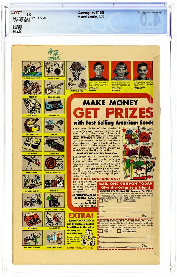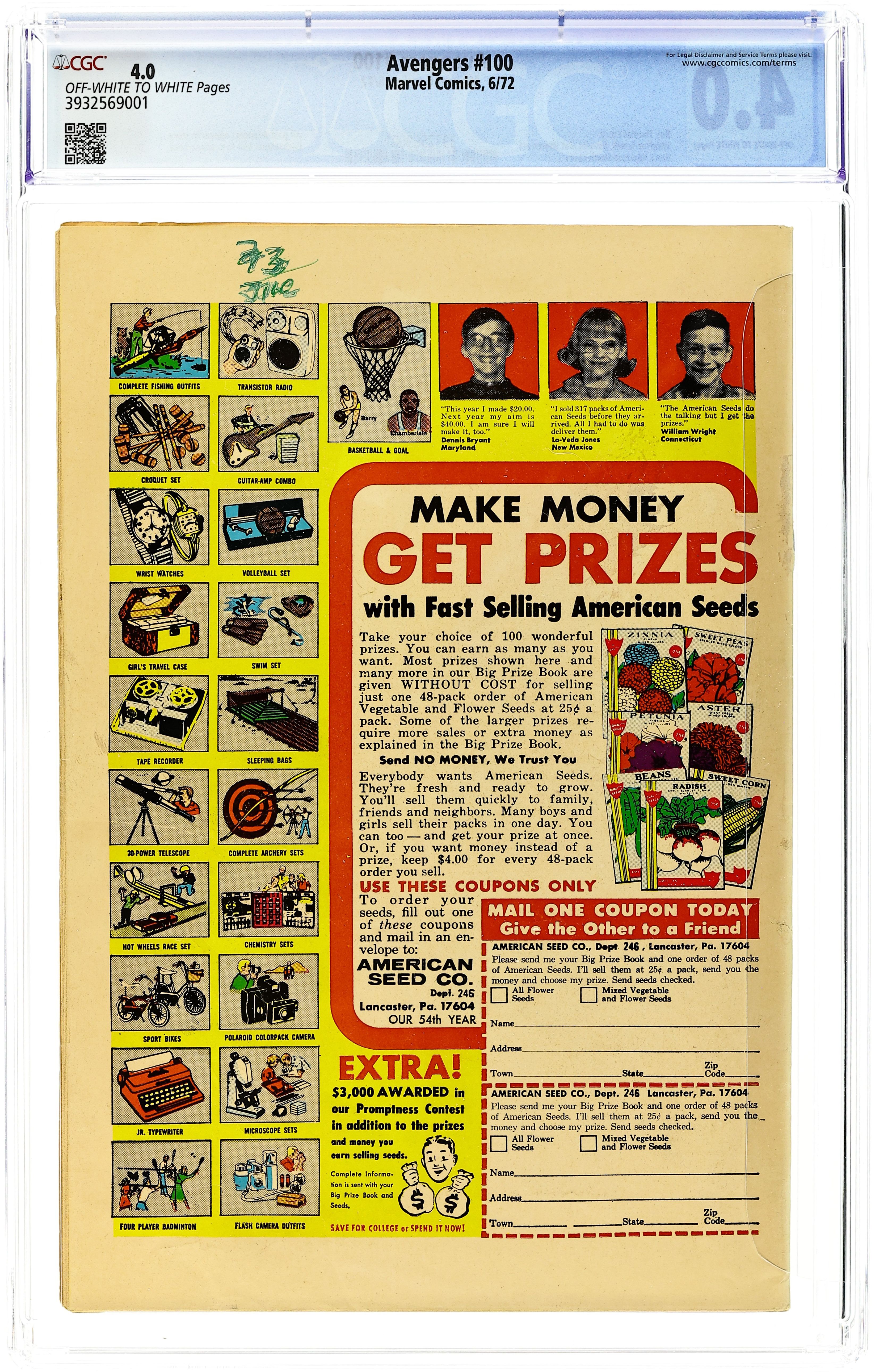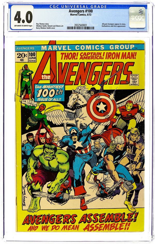 Ended Jun 10 2025 Winning Bid $41 Cover by Barry Windsor-Smith. This landmark 100th issue features everyone who has previously been an Avenger. "Whatever Gods There Be!", script by Roy Thomas, pencils by Barry Windsor-Smith, inks by Windsor-Smith (pages 1-6, 12), Joe Sinnott (pages 7-11, 13, 14) and Syd Shores (pages 15-23); Bringing warning of impending doom, an amnesiac Hercules is captured by Ares, prompting the Avengers to call out for aid from all their members, past and present. Traveling to the Black Knight's castle for aid, all the members arrive, including the Hulk who is convinced to join their fight. The group enters the Black Knight's castle where in the basement Dane summons the spirit of his ancestor, the original Black Knight, who reveals to them the chain of events that brought all of them together; The group splits in two, one group remaining on Earth to battle any Olympian invaders, and the other to travel to Olympus to free Hercules and stop Ares. Avengers roll call: Thor, Captain America, Iron Man, Hawkeye, Quicksilver, the Scarlet Witch, and the Vision. Guest starring the Hulk, Ant-Man, the Black Knight, the Black Panther, Hercules, and the Swordsman. 36 pgs., full color. $0.20. Cover price $0.20. Grade: CGC 4.0 explanation of grade Condition: Used (collectible)