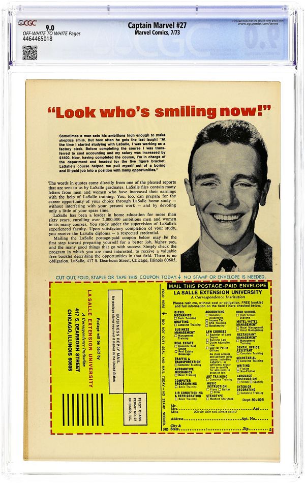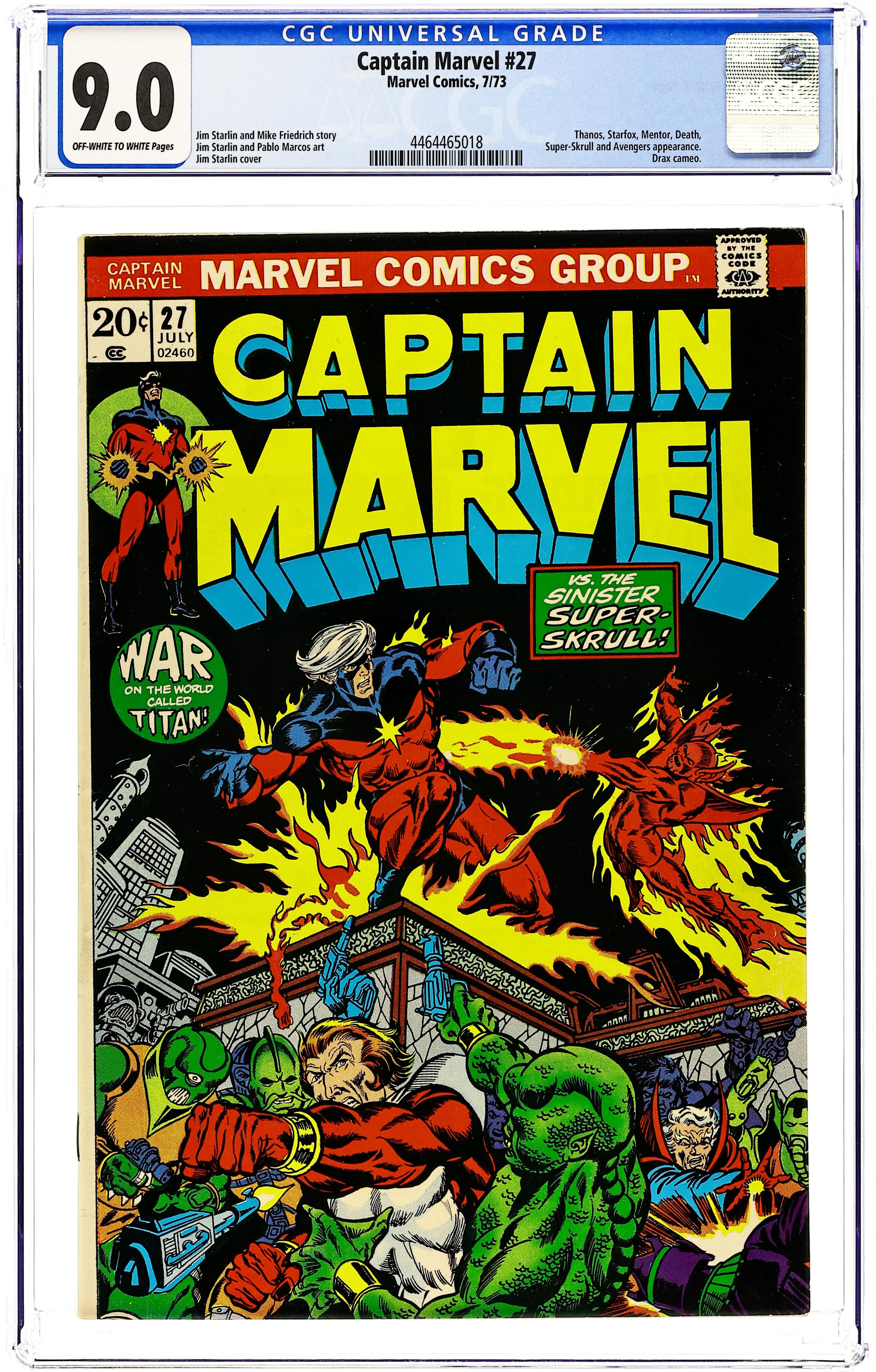 The Super-Skrull continues to pester Captain Marvel in "Trapped on Titan!" Script by Mike Friedrich, plot and pencils by Jim Starlin, inks by Pablo Marcos. Meanwhile, Thanos seeks out the Cosmic Cube. Cameos by the Thing (of the Fantastic Four), the Avengers (Captain America, Iron Man, the Scarlet Witch, the Vision, and the Black Panther), and Drax the Destroyer. This issue also contains a map of Titan. Cover price $0.20. Grade: CGC 9.0 explanation of grade Condition: Used (collectible)