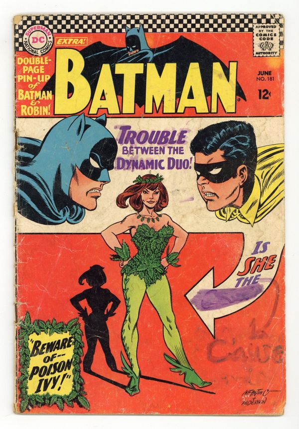 Ended May 20 2025 Winning Bid $81 The 1st appearance of Poison Ivy. Cover pencils by Carmine Infantino, inks by Murphy Anderson. "Beware of--Poison Ivy!", script by Robert Kanigher, pencils by Sheldon Moldoff (as Bob Kane), inks by Joe Giella; While Bruce and Dick are attending an art show, a woman shows up, claiming to be the greatest criminal of those currently residing in Gotham. Centerspread is a great two-page color poster of Batman and Robin, pencils by Carmine Infantino, inks by Murphy Anderson. "The Perfect Crime--Slightly Imperfect!", script by Gardner Fox, inks by Sid Greene; At the latest meeting of the Anaylists, Kaye announces that she didn't write her latest book, and seems to be threatened by a voice from her brooch; Batman has a feeling that the Kaye at the meeting is an imposter, so he looks into the matter. Letter from future comics writer Mike Friedrich. Rocky and Bullwinkle star in a one-page Cheerios ad. 36 Pages, Full Color. Cover price $0.12. Grade: PR 0.5 explanation of grade Condition: Used (collectible)