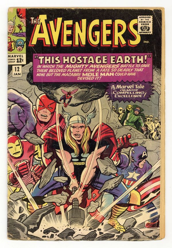 Ended Jun 6 2025 Winning Bid $27 Cover pencils by Jack Kirby, inks by Chic Stone. "This Hostage Earth!", script by Stan Lee, pencils by Don Heck, inks by Dick Ayers; Ants warn Giant Man that there is something wrong, but none of the other Avengers believe him; In truth, it is the Mole Man, who plans to destroy the surface world by making the Earth spin very fast on its axis; And now, with his new ally the Red Ghost, how can he be stopped? Avengers Roll Call: Captain America, Thor, Iron Man, Giant Man, Wasp, and Rick Jones. Villains: the Red Ghost, the Mole Man, and the first appearance of Monk Keefer. Flashback cameos by Mr. Fantastic, Invisible Girl, and Human Torch (of the Fantastic Four). Letters to the editor from science fiction writer George R.R. Martin and Steve Erickson (the writer?). Reprinted in Marvel Triple Action # 6. 36 pgs., full color. $0.12. Cover price $0.12. Grade: GD 2.0 explanation of grade Condition: Used (collectible)
