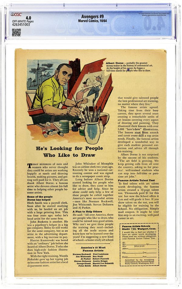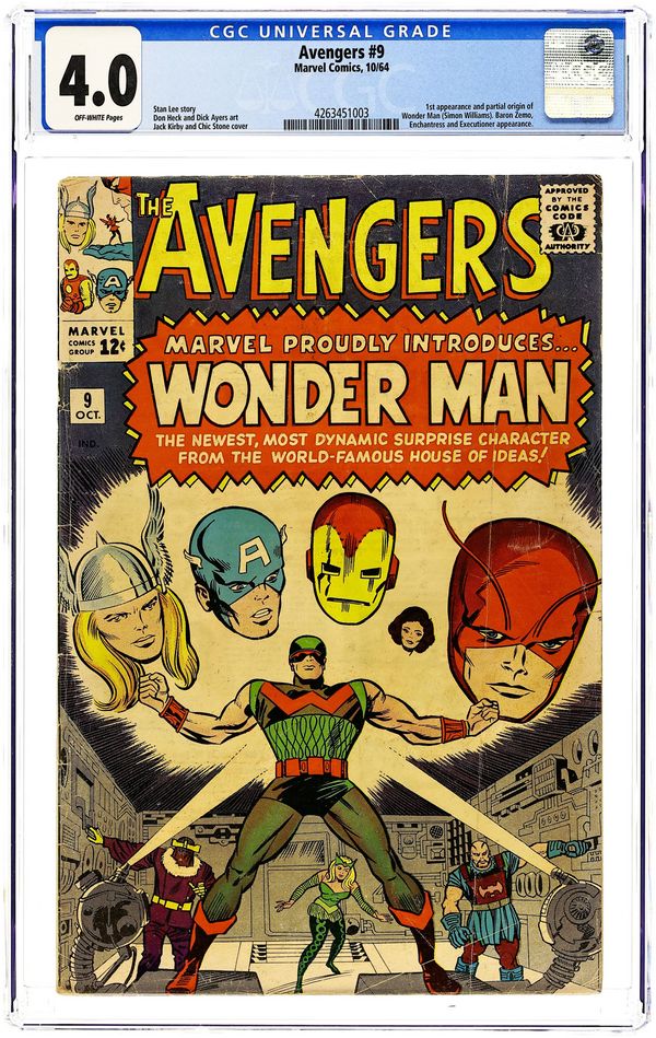 Ended Jun 24 2025 Winning Bid $187 Cover pencils by Jack Kirby, inks by Chic Stone. First appearance of Wonder Man in "The Coming of the... Wonder Man!", script by Stan Lee, pencils by Don Heck, inks by Dick Ayers; Baron Zemo and the Masters of Evil transform Simon Williams into Wonder Man and send him to infiltrate the Avengers; Instead, he winds up allying with them at the cost of his own life. Roster: Captain America, Thor, Iron Man, Giant-Man, and the Wasp. Villains: Executioner, the Enchantress, and Baron Zemo. Cameo appearance by Bucky. 36 pgs., full color. $0.12. Cover price $0.12. Grade: CGC 4.0 explanation of grade Condition: Used (collectible)