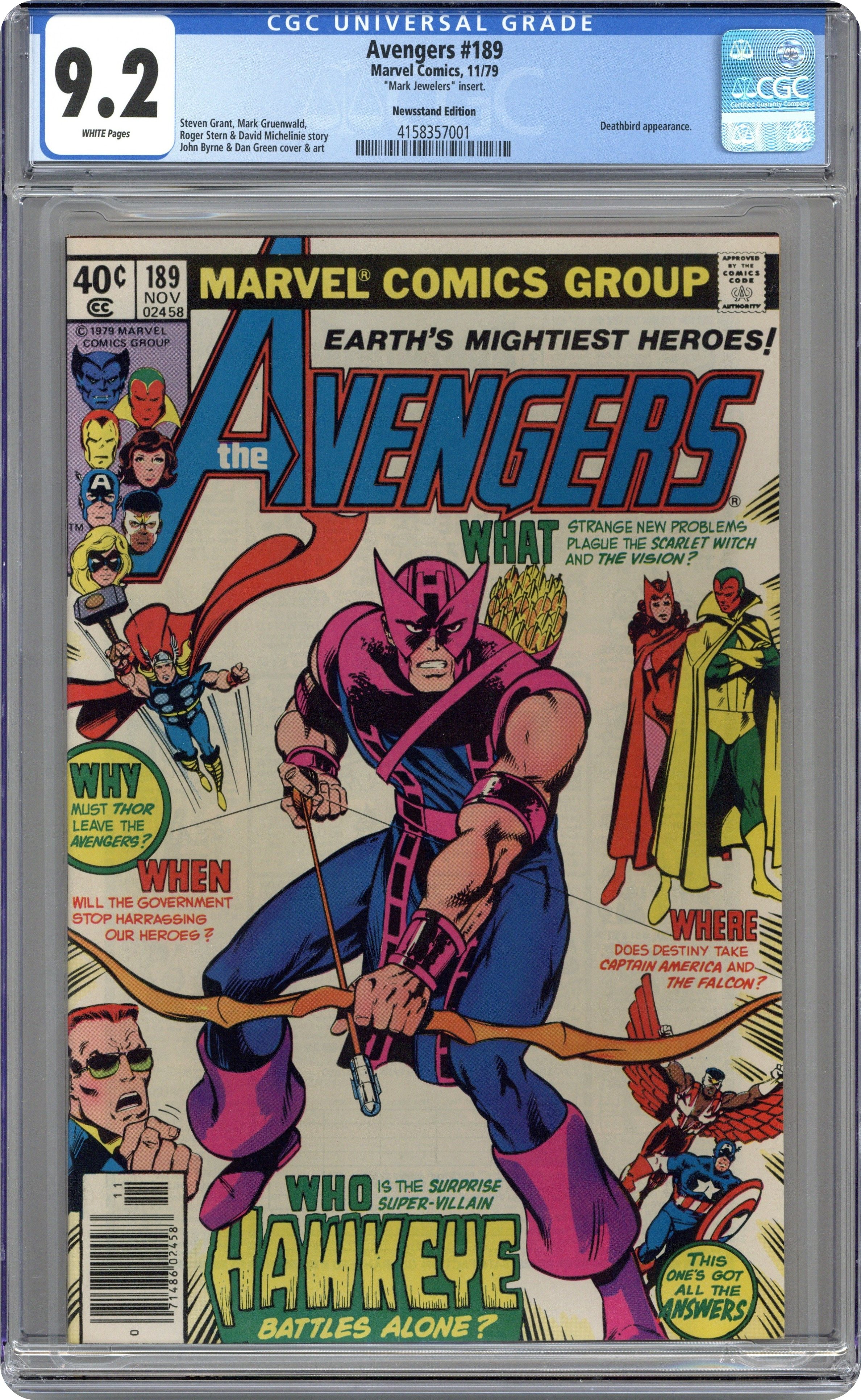 Ended Jun 23 2025 Winning Bid $61 Mark Jeweler Advertisement Insert Variant. "Wings and Arrows!" Plot by Steven Grant, Mark Gruenwald and Roger Stern. Script by Steven Grant. Pencils by John Byrne. Inks by Dan Green. Cover by John Byrne and Terry Austin. The Avengers' titanic tussle with Arsenal (in Avengers Annual 9) is over. And now the team is getting back to normal and re-establishing the government-mandated seven person roster. But Clint Barton is not on that roster, so the Avengers' former ace archer must find another job. Hawkeye receives a nice lead from Jarvis and lands a security position with Cross Enterprises! However trouble isn't too far behind, and just a few days later Hawkeye gets to strut his stuff vs. the Shi'ar warrior...Deathbird! Cameo appearances by Peter Gyrich and Jocasta. (Notes: Deathbird appears next in Uncanny X-Men 155.) 32 pages Cover price $0.40. Grade: CGC 9.2 explanation of grade Condition: Used (collectible)