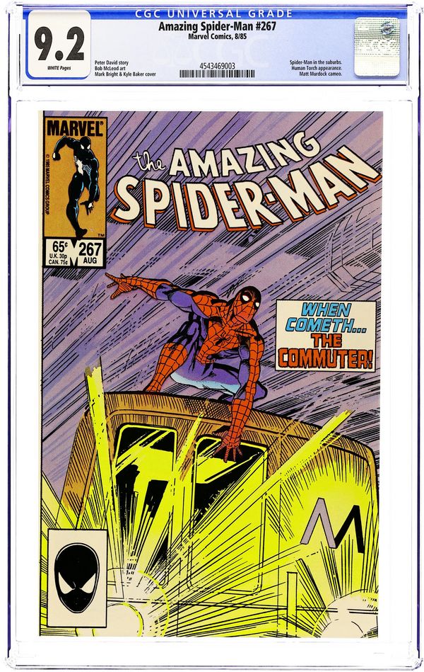 Ended Jul 28 2025 Bid History 4 bids Winning Bid $26 Direct Edition. "The Commuter Cometh!" Script by Peter David. Art by Bob McLeod. Cover by Mark Bright and Kyle Baker. The Amazing Spider-Man leaves the big city and travels to the suburbs to catch a robber! But once the web-slinger arrives in Scarsdale, he discovers that suburban life is nothing like his daily life in New York City! Out in suburbia there aren't any tall buildings for web-swinging or rooftops to leap over! So, Spidey has to travel by foot and avoid the neighborhood watch patrol! Fortunately, the proportionate speed, strength, and agility of a spider play just as well in the 'burbs as they do in Manhattan! And the web-slinger eventually gets his man! Cameo appearances by the Human Torch and Matt Murdock. (Note: Spider-Man wears both of his costumes in this issue -- first the black one and then the traditional red and blue.) 36 pgs. Cover price $0.65. Grade: CGC 9.2 explanation of grade Condition: Used (collectible)