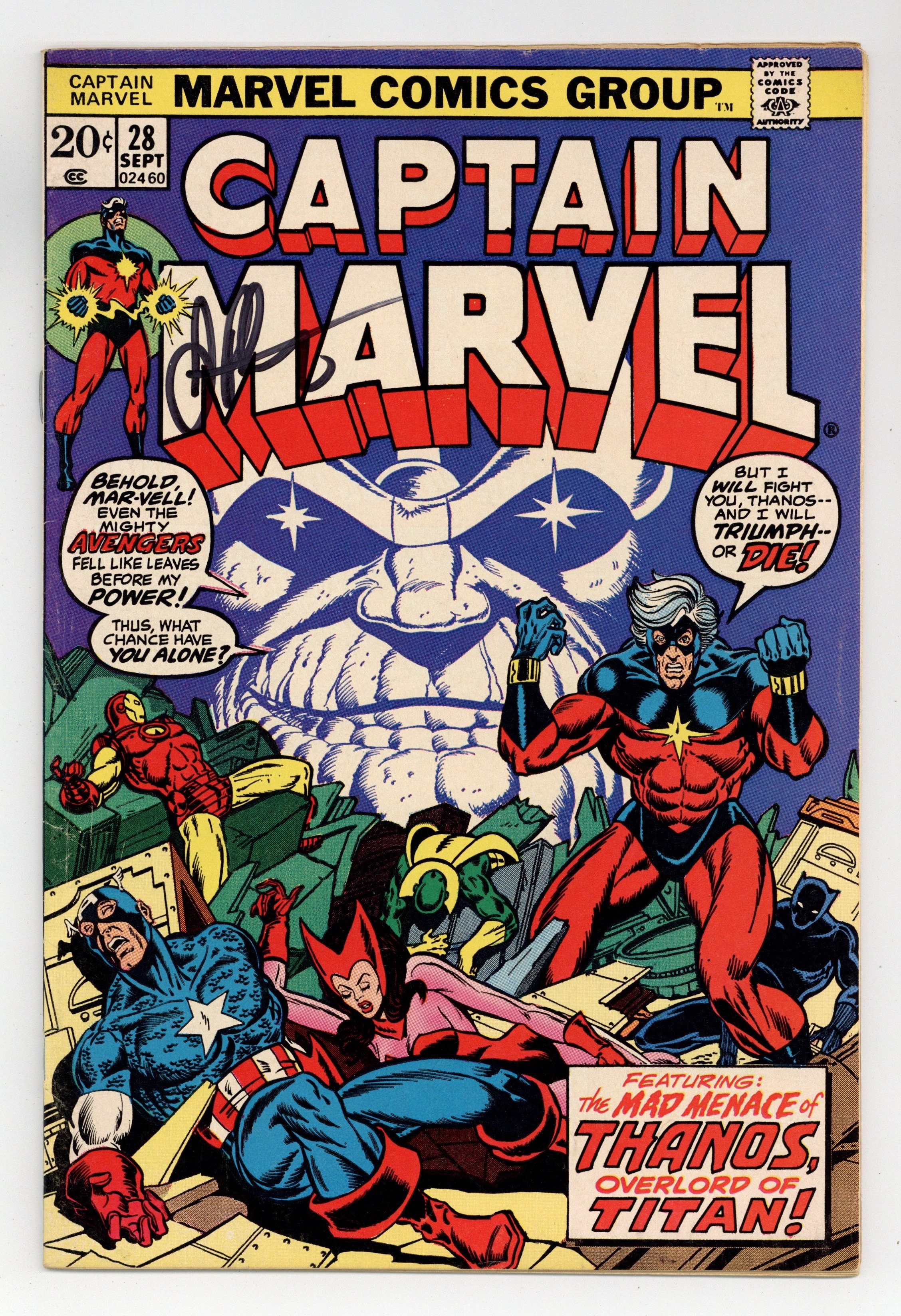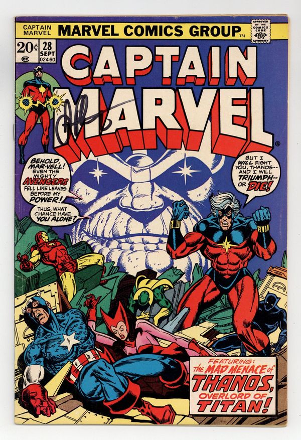 Ended Jun 3 2025 Winning Bid $71 Thanos defeats Drax the Destroyer and obtains the Cosmic Cube--and that can't be a good thing! The Avengers (Captain America, Iron Man, the Scarlet Witch, the Vision, and the Black Panther) guest star in "When Titans Collide!" Plot, pencils, and script (chapter 2) by Jim Starlin, script (chapters 1 and 3) by Mike Friedrich, inks by Dan Green. (Splash page art retouches by John Romita Sr.). Captain Marvel battles the Controller. Drax the Destroyer appearance. Starlin cover pencils. Cover price $0.20. Grade: VG/FN 5.0 explanation of grade Condition: Used (collectible)